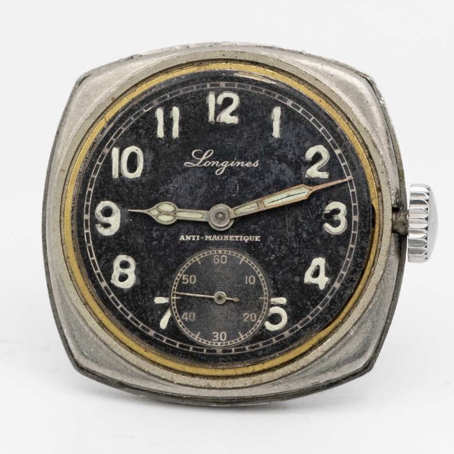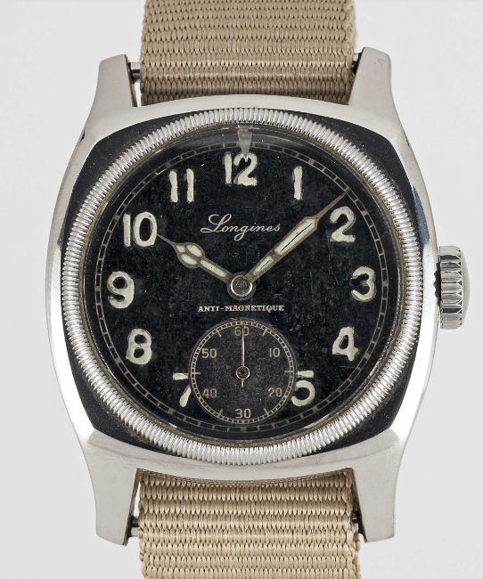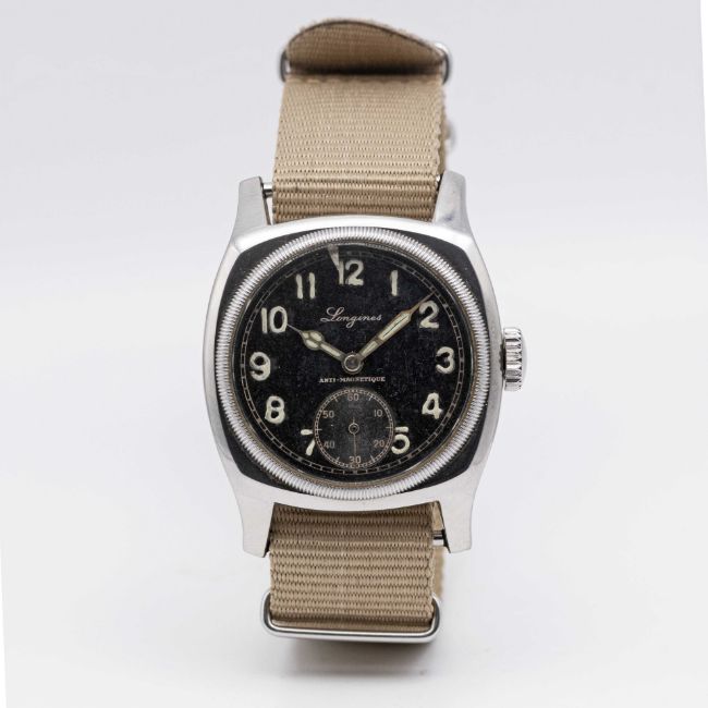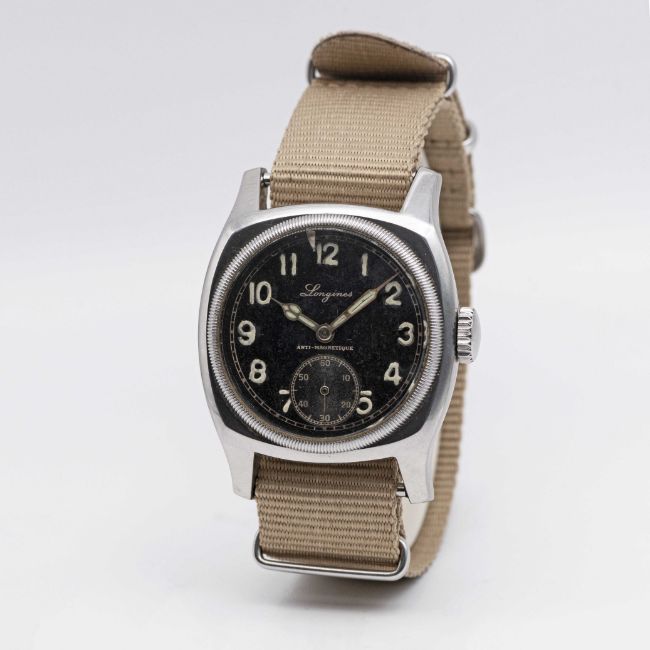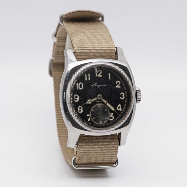 A GENTLEMAN'S STAINLESS STEEL CZECH MILITARY AIR FORCE LONGINES PILOTS WRIST WATCHCIRCA 1947Movement: Manual wind, cal. 13.68Z, signed Longines, numbered.Case: Width approx. 41mm, fixed bars, signed Longines, numbered, lug numbered, issue markings MAJETEK VOJENSKE SPRAVY 1806, rotating bezel.Strap: NATO.CONDITION REPORTDial: Original dial in good condition, showing some signs of age. Movement: Running & functioning at present, timekeeping and accuracy cannot be guaranteed.Case: In very good condition, with some scratches due to general use.Strap: In excellent condition.