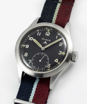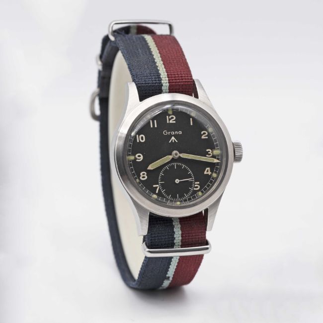 A RARE GENTLEMAN'S STAINLESS STEEL BRITISH MILITARY GRANA W.W.W. WRIST WATCHCIRCA 1945, THE RAREST OF THE "DIRTY DOZEN", HAVING BEEN ORDERED BY THE MOD IN THE FEWEST NUMBERS (APPROX. 1000-1500) OUT OF THE TWELVE BRANDS CONTRACTEDMovement: 15J, manual wind, cal. K.F.320.Case: Diameter approx. 36mm, fixed bars, screw back, numbered 55x,xxx to inside case back, issue markings ^ W.W.W. M18600, dust cover.Strap: Nato.CONDITION REPORTDial: Original dial in very good condition, showing signs of age. Movement: Running & functioning at present, timekeeping and accuracy cannot be guaranteed.Case: In excellent condition, with some some scratches due tol use.Strap: In very good condition.