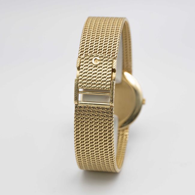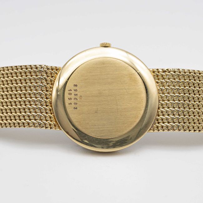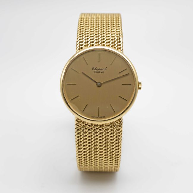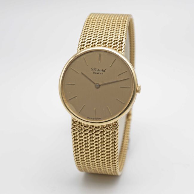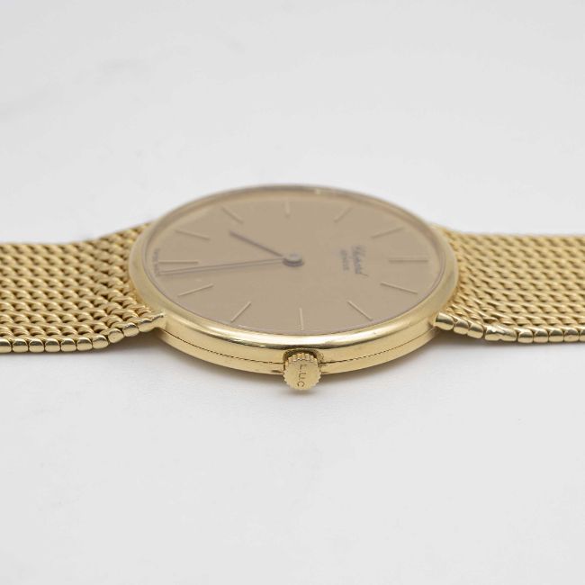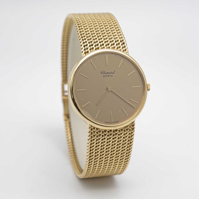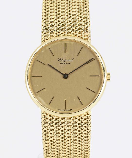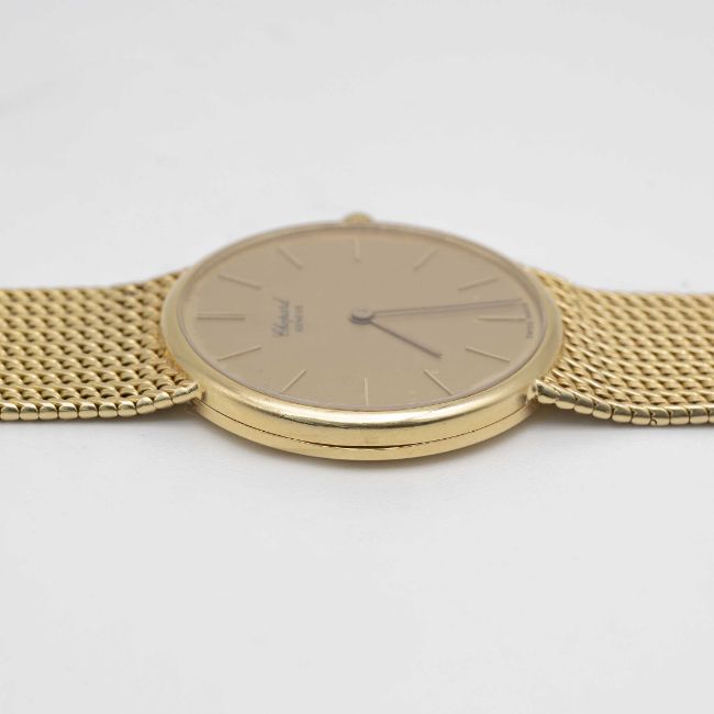 A GENTLEMAN'S SIZE 18K SOLID YELLOW GOLD CHOPARD BRACELET WATCHCIRCA 1980s, REF. 1091 ACCOMPANIED BY CHOPARD WATCH POUCHMovement: Quartz, signed Chopard.Case: Diameter approx. 32mm, signed L.U.C.,18k hallmarks, numbered, original Chopard crown signed L.U.C.Bracelet: Original Chopard 18k solid gold bracelet, 18k hallmark, total length approx. 185mm.CONDITION REPORTDial: Original dial in good condition, showing some signs of age.Movement: Running & functioning at present, timekeeping and accuracy cannot be guaranteed.Case: In very good condition, with some light scratches due to general use.Strap/Bracelet: In very good condition.