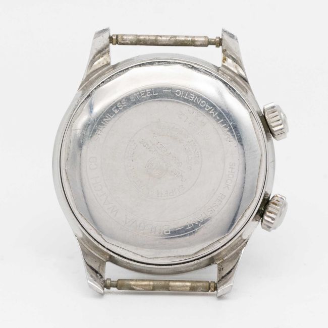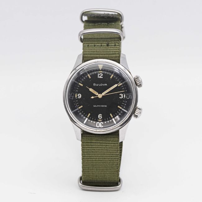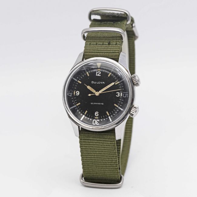 A RARE GENTLEMAN'S STAINLESS STEEL BULOVA SELFWINDING SUPER WATERPROOF BRACELET WATCHCIRCA 1960s, WITH GLOSS BLACK DIALMovement: 17J, automatic, signed Bulova Watch Co.Case: Diameter approx. 36mm, compressor case, super waterproof emblem embossed on case back, signed Bulova Watch Co, numbered, inner rotating 60min bezel, Bulova crowns.Strap: NATOCONDITION REPORTDial: Original dial in very good condition.Movement: Running & functioning at present, timekeeping and accuracy cannot be guaranteed.Case: In excellent condition, with some small scratches due to general use.Strap: In excellent condition.