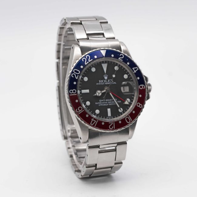A GENTLEMAN'S STAINLESS STEEL ROLEX OYSTER PERPETUAL DATE GMT MASTER "PEPSI" BRACELET WATCHCIRCA 1973, REF. 1675 WITH ROLEX SERVICE DIAL & HANDSMovement: 27J, automatic chronometer, cal. 1530, signed Montres Rolex S.A., numbered.Case: Diameter approx. 40mm, Oyster case, signed Montres Rolex S.A., dated III.72, 24 hour rotating "Pepsi" bezel, Rolex crown.Bracelet: Original Rolex Oyster folded link bracelet, numbered 7836/380, dated 4/72.CONDITION REPORTDial: Service dial in very good condition, showing some small signs of age. Movement: Running & functioning at present, timekeeping and accuracy cannot be guaranteed.Case: In very good condition, with some small scratches & light wear due to general use.Bracelet: In fair condition, with some wear and dents to the links.