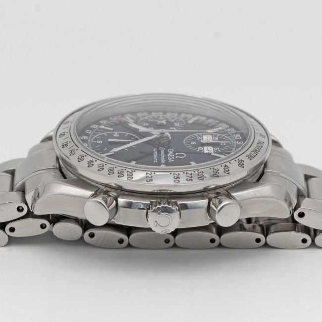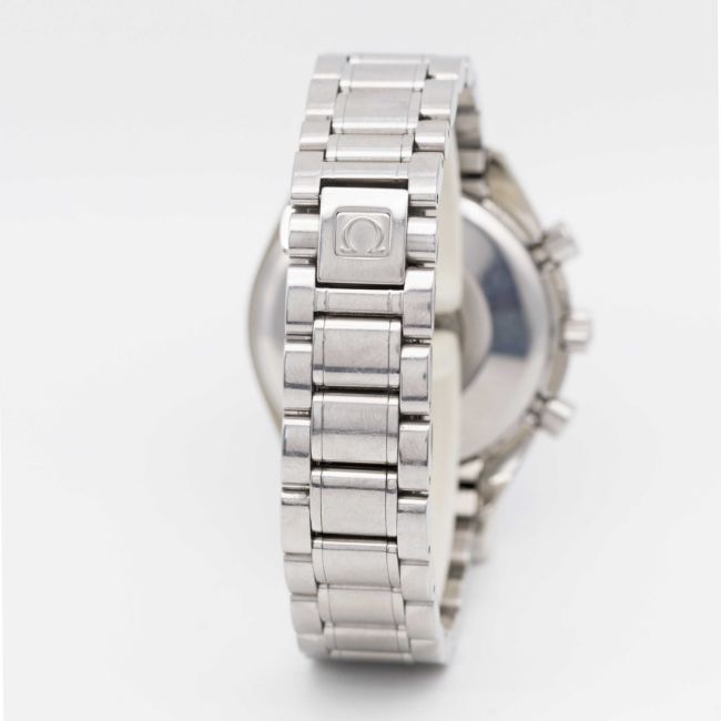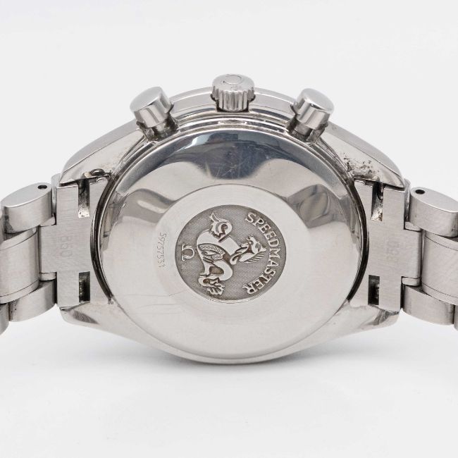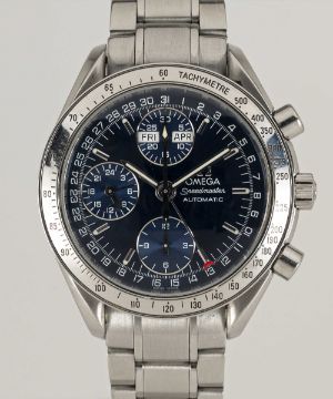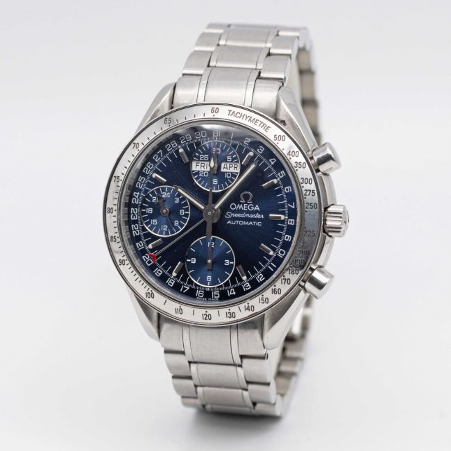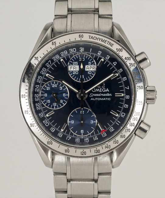 A GENTLEMAN'S STAINLESS STEEL OMEGA SPEEDMASTER TRIPLE CALENDAR AUTOMATIC CHRONOGRAPH BRACELET WATCHCIRCA 2000, REF. 3523.80.00Movement: Automatic, signed Omega Watch Co.Case: Diameter approx. 39mm, Speedmaster emblem embossed onto case back, signed Omega, numbered, tachymetre bezel, Omega crown.Bracelet: Original Omega Speedmaster bracelet, no (62) 1563/850.CONDITION REPORTDial: Original dial in excellent condition.Movement: Running & functioning at present, timekeeping and accuracy cannot be guaranteed.Case: In very good condition, with some scratches on the case back due to general use.Bracelet: In good condition, with scratches due to general use.
