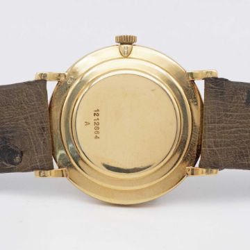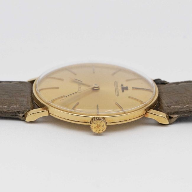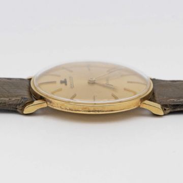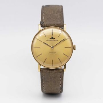 A GENTLEMAN'S 18K SOLID GOLD JAEGER LECOULTRE WRIST WATCHCIRCA 1960s ORIGINALLY RETAILED BY TURLER WITH CO-SIGNED DIALMovement: Manual wind, signed Jaeger-LeCoultre, numbered.Case: Approx. 33mm, snap back, signed Jaeger-LeCoultre, 18k hallmarks, numbered.Strap: Leather.CONDITION REPORTDial: Original dial in very good condition showing some signs of age.Movement: Running & functioning at present, timekeeping and accuracy cannot be guaranteed.Case: In very good condition, with some light scratches due to general use.Strap: In excellent condition.