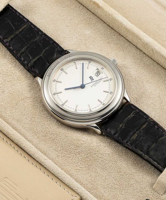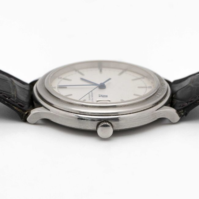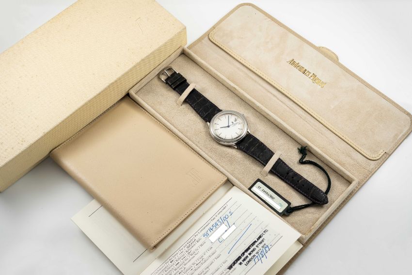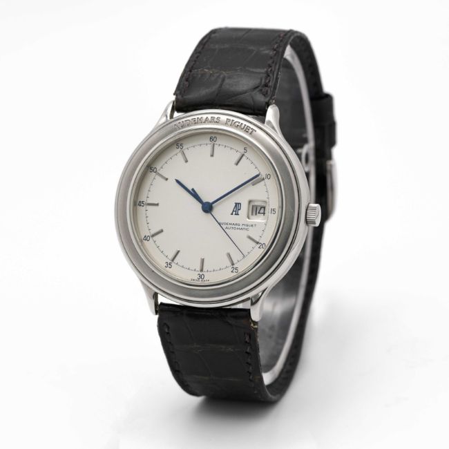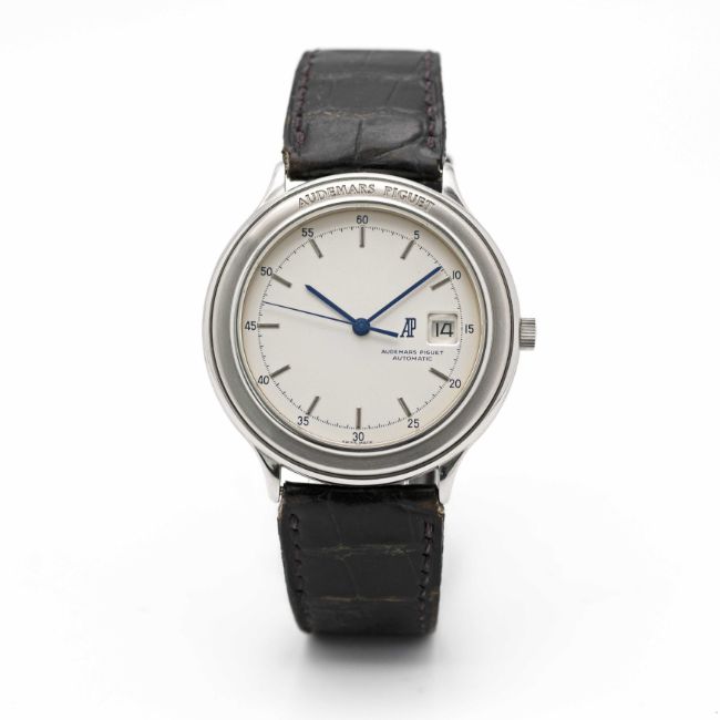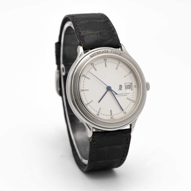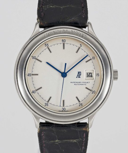 A RARE GENTLEMAN'S STAINLESS STEEL AUDEMARS PIGUET HUITIEME AUTOMATIC WRIST WATCHDATED 1989, REF. ST14593/002 ACCOMPANIED BY ORIGINAL BOX, POUCH, GUARANTEE AND SWING TAG Movement: Automatic, cal. 2125, numbered, signed Audemars Piguet.Case: Diameter approx. 40.5mm, signed Audemars Piguet, numbered.Strap: Leather strap with original stainless steel AP pin buckle.CONDITION REPORTDial: Original dial in excellent condition.Movement: Running & functioning at present, timekeeping and accuracy cannot be guaranteed. Rotor can be heard knocking on case. Case: In excellent condition.Strap: In fair condition, showing signs of age due to general use.