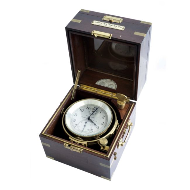 A MODEL 21 TWO DAY HAMILTON WATCH CO SHIPS CHRONOMETER CLOCK CIRCA 1940s, WITH ORIGINAL OUTER TRAVEL BOXMovement: 14J, manual key wind, fusee chronometer, signed Hamilton Watch Co. Lancaster, Penna, numbered.Case: brass gimballed case, diameter approx. 125mm, mahogany box with brass fittings and an out travel box, signed Hamilton Watch Co. Lancaster, PA, USA.  CONDITION REPORTDial: Original dial in good condition, showing signs of age Movement: Running & functioning at present, timekeeping and accuracy cannot be guaranteed. Case: In very good condition, with some discolouration, wooden cases are both in very good condition.