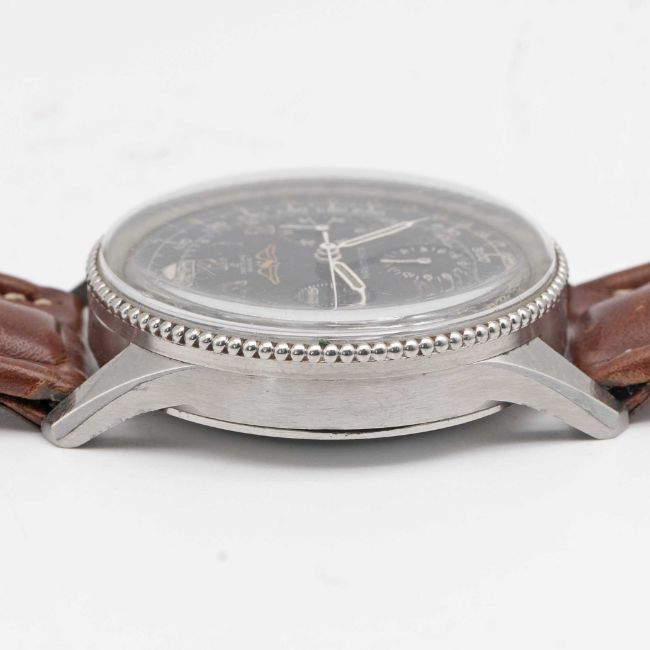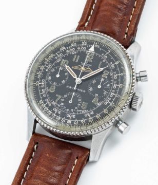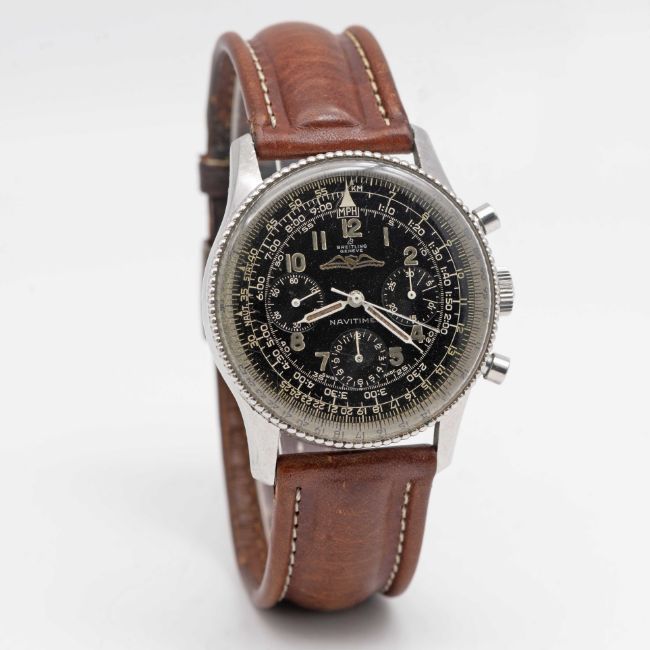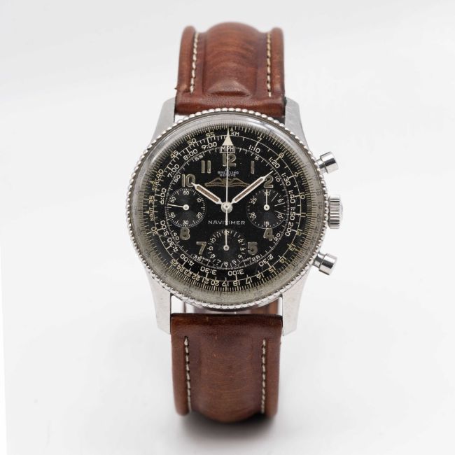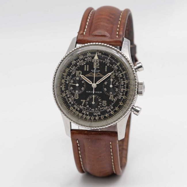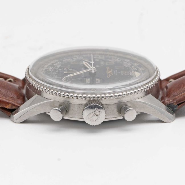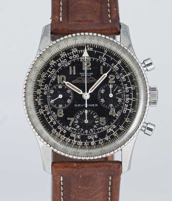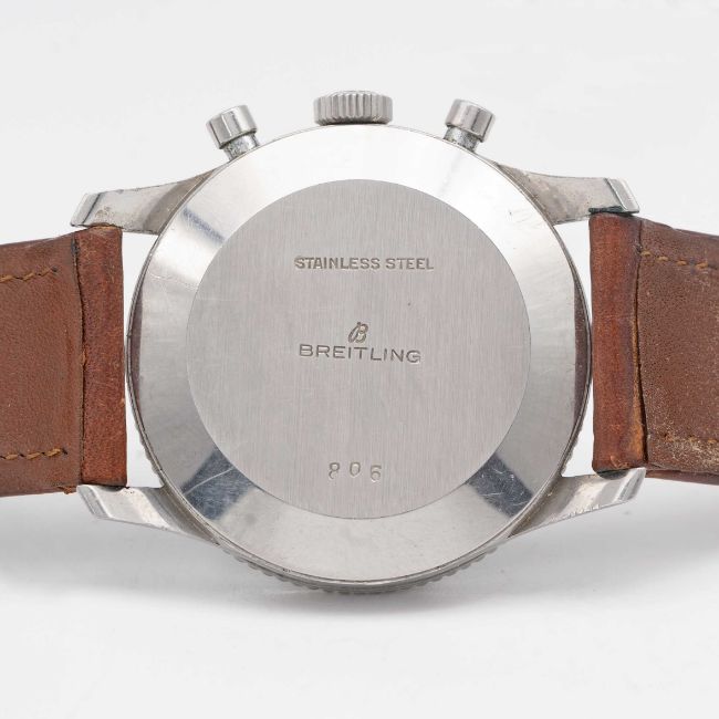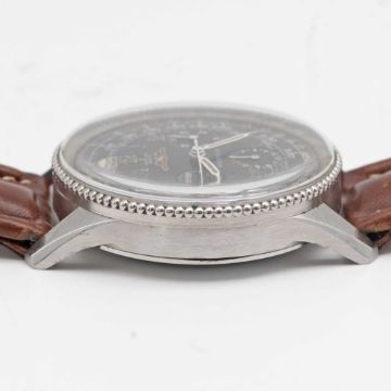 A RARE GENTLEMAN'S STAINLESS STEEL BREITLING NAVITIMER AOPA CHRONOGRAPH WRIST WATCHCIRCA 1960, REF. 806 WITH "ALL BLACK" DIAL & BEADED BEZELMovement: 17J, manual wind, Venus cal. 178, signed Breitling Watch Corp, marked WOG the US import code. Case: Diameter approx. 40mm, snap back, signed Breitling, numbered 92x,xxx, slide rule beaded bezel, Breitling crown.Strap: Leather.CONDITION REPORTDial: Original dial in very good condition, inner slide rule showing signs of age.Movement: Running & functioning at present, timekeeping and accuracy cannot be guaranteed.Case: In good condition, with some scratches and wear due to general use.Strap/Bracelet: In fair condition.