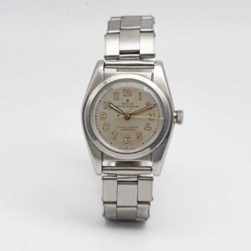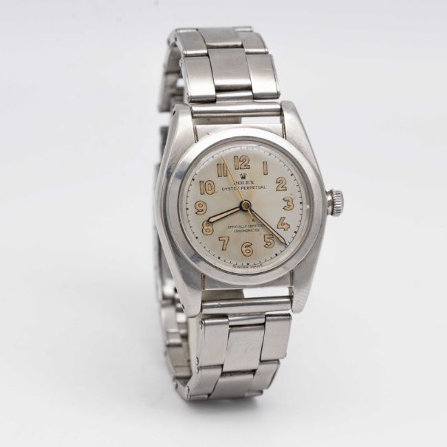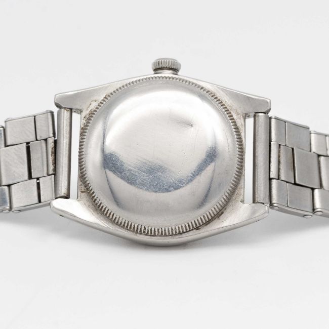 A RARE GENTLEMAN'S STAINLESS STEEL ROLEX OYSTER PERPETUAL CHRONOMETER "BUBBLE BACK" BRACELET WATCHCIRCA 1946, REF. 2940Movement: Automatic chronometer, signed Rolex, numbered.Case: Diameter approx. 33mm, signed Rolex, serial no. 39x,xxx, original Rolex Oyster crown.Bracelet: Stainless steel Rolex Oyster riveted bracelet, signed Rolex S.A., dated 4.48.CONDITION REPORTDial: Original dial in excellent condition, showing very small signs of age.Movement: Running & functioning at present, timekeeping and accuracy cannot be guaranteed.Case: In very good condition, with some light scratches due to general use.Strap/Bracelet: In very good condition.