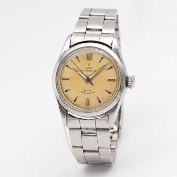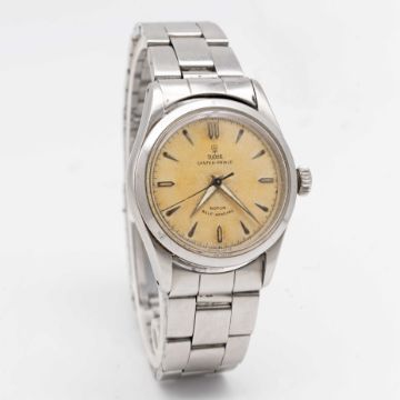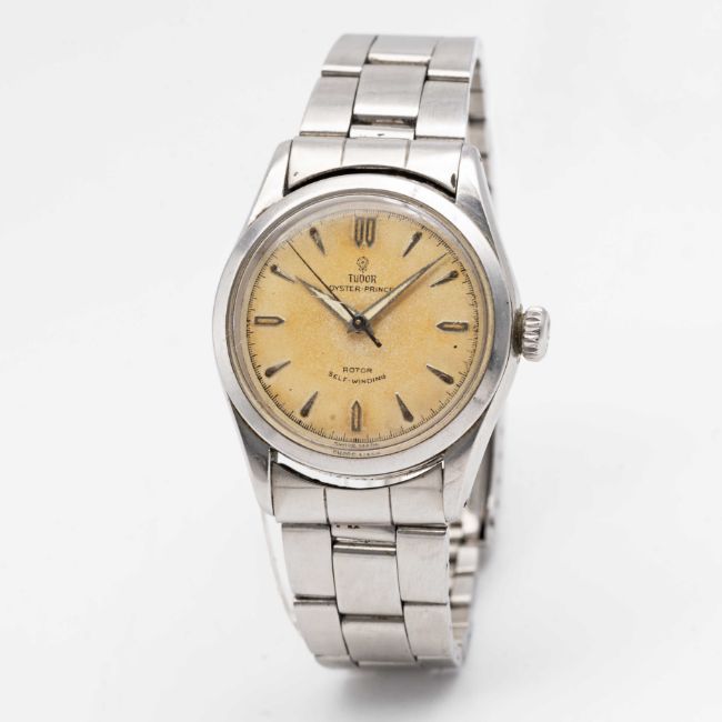 A GENTLEMAN'S STAINLESS STEEL TUDOR OYSTER PRINCE SELF WINDING BRACELET WATCHCIRCA 1950s, REF. 7909 Movement: 17J, automatic, "butterfly" rotor, signed Tudor Auto Prince.Case: Diameter approx. 34mm, Oyster case, signed Montres Tudor S.A., serial no. 14x,xxx, Rolex Brevet + crown.Bracelet: Rolex Oyster bracelet, numbered 7835/19/357.CONDITION REPORTDial: Original dial in good condition, showing an even patinaMovement: Running & functioning at present, timekeeping and accuracy cannot be guaranteed.Case: In very good condition, with some scratches and wear due to general use.Strap/Bracelet: In very good condition, showing some scratches and wear due to general use.