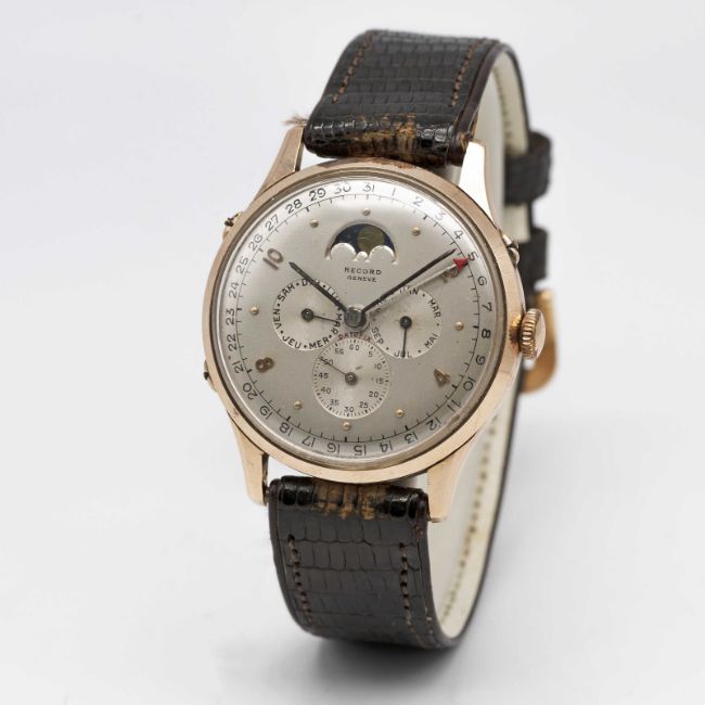 A RARE GENTLEMAN'S 14K SOLID GOLD RECORD DATOFIX MOONPHASE TRIPLE CALENDAR WRIST WATCHCIRCA 1950, REF. 1121 WITH BOX & ORIGINAL INSTRUCTION MANUALMovement: 16J, manual wind, cal. 106, signed Record Watch Co Geneve.Case: Diameter approx. 35mm, snap back, signed Record Watch Co Geneve, 14k hallmarks, numbered.Strap: Leather.CONDITION REPORTDial: Original dial in very good condition.Movement: Running & functioning at present, timekeeping and accuracy cannot be guaranteed.Case: In very good condition, with some light scratches and wear due to general use.Strap/Bracelet: In good condition.