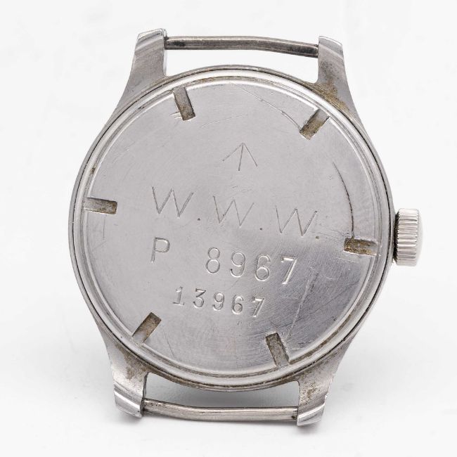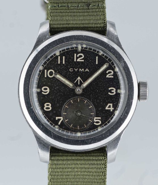 A GENTLEMAN'S STAINLESS STEEL BRITISH MILITARY CYMA W.W.W. WRIST WATCHCIRCA 1945, PART OF THE "DIRTY DOZEN"Movement: 15J, manual wind, cal. 234, signed Cyma, numbered.Case: Diameter approx. 38mm, fixed bars, screw back, issue markings ^ W.W.W. P18233 13967, dust cover.Strap: NATO.CONDITION REPORTDial: Original dial in very good condition, showing some signs of age.Movement: Running & functioning at present, timekeeping and accuracy cannot be guaranteed.Case: In excellent condition, with some light scratches due to general use.Strap/Bracelet: In excellent condition.