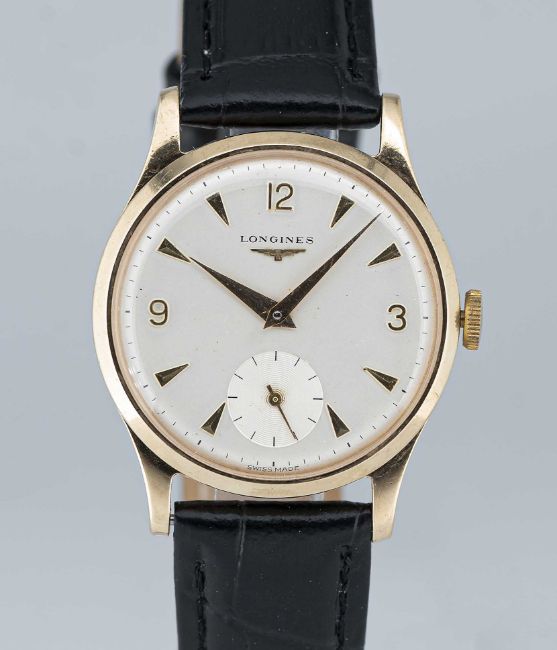 A GENTLEMAN'S 9CT SOLID GOLD LONGINES WRIST WATCHCIRCA 1966, REF. 13322Movement: 17J, manual wind, cal. 30L, signed Longines, numbered 12.8xx.xxx.Case: Diameter approx. 33.4mm, signed Baume Made in England, 9ct hallmarks, numbered.Strap: Leather.CONDITION REPORTDial: Original dial in excellent condition.Movement: Running & functioning at present, timekeeping and accuracy cannot be guaranteed.Case: In very good condition, with some light scratches due to general use.Strap/Bracelet: In excellent condition.