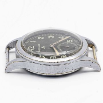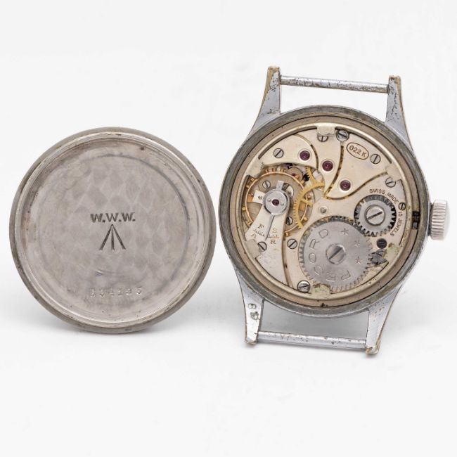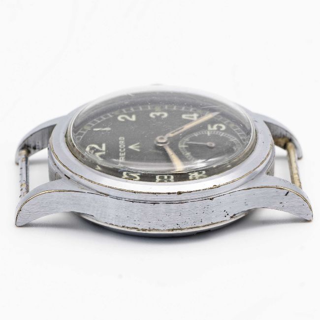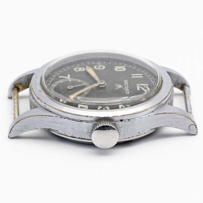 A GENTLEMAN'S BRITISH MILITARY RECORD W.W.W. WRIST WATCHCIRCA 1945, PART OF THE "DIRTY DOZEN", WITH "TROPICAL" BROWN DIALMovement: 15J, manual wind, cal. 022K, signed Record.Case: Diameter approx. 36mm, fixed bars, nickel plated case with steel screw back, issue markings W.W.W. ^ L16348 534195, lug numbered 810. Strap: NATO.CONDITION REPORTDial: Original dial in good condition, showing some signs of age & patina.Movement: Running & functioning at present, timekeeping and accuracy cannot be guaranteed.Case: In very good condition, with some small scratches & light wear due to use.Strap/Bracelet: In excellent condition.