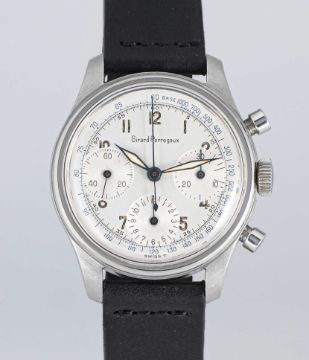 A RARE GENTLEMAN'S STAINLESS STEEL GIRARD PERREGAUX "WATERPROOF" CHRONOGRAPH WRIST WATCHCIRCA 1960s, WITH VALJOUX 72 MOVEMENTMovement: 17J, manual wind, Valjoux cal. 72, signed Girard-Perregaux & Co., US import code GXM.Case: Diameter approx. 35mm, screw back, signed Girard-Perregaux, numbered 26x,xxx, dust cover.Strap: Leather.CONDITION REPORTDial: Original dial in excellent condition.Movement: Running & functioning at present, timekeeping and accuracy cannot be guaranteed.Case: In excellent condition, with light scratches due to general use.Strap/Bracelet: In excellent condition.