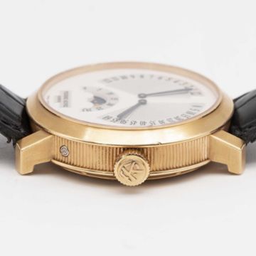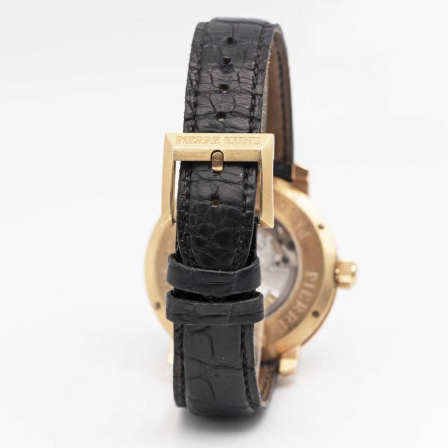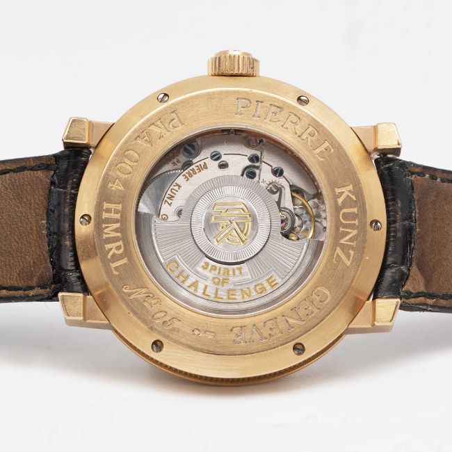A GENTLEMAN'S 18K SOLID ROSE GOLD PIERRE KUNZ GRANDE RETROGRADE WRIST WATCHCIRCA 2000s, REF. PKA004 HMRL, WITH "COIN EDGE" CASE Movement: Automatic, ETA cal, PK 2001, signed Pierre Kunz Geneve, Spirit of Challenge, numbered.Case: Diameter approx. 41mm, exhibition case back, signed Pierre Kunz Geneve, 18k hallmarks, numbered, original PK crown.Strap: Pierre Kunz leather strap & 18k solid gold pin buckle.CONDITION REPORTDial: Original dial in excellent condition.Movement: Running & functioning at present, timekeeping and accuracy cannot be guaranteed.Case: In very good condition, with some scratches and wear due to general use.Strap/Bracelet: In fair condition.