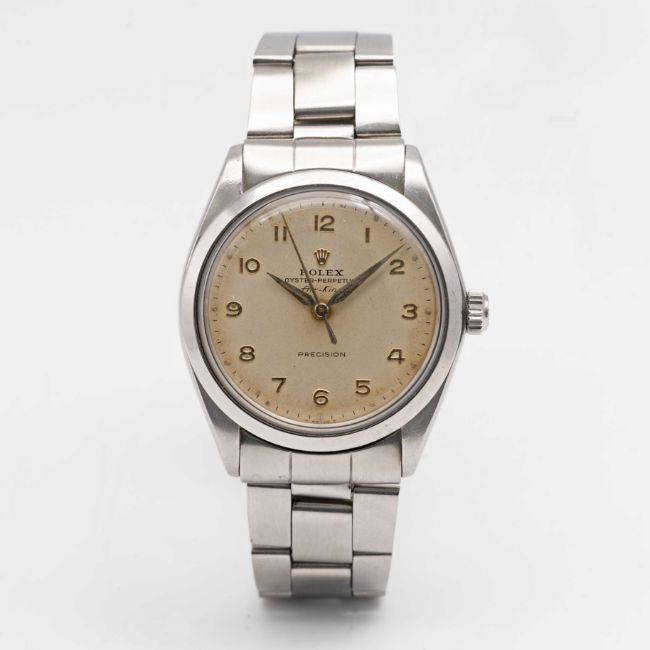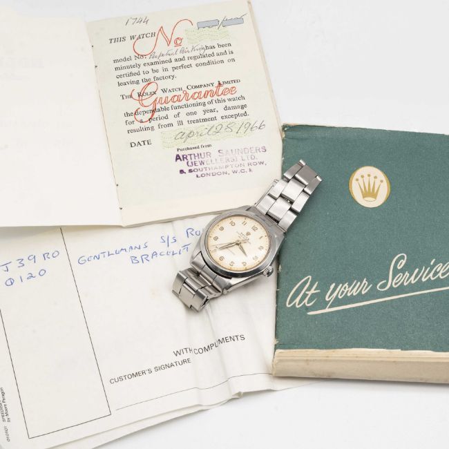 A GENTLEMAN'S STAINLESS STEEL ROLEX OYSTER PERPETUAL AIR KING PRECISION BRACELET WATCHDATED 1966, REF. 5500, WITH ROLEX GUARANTEE PAPERWORK & BOOKLETMovement: 26J, automatic, cal. 1520, signed Rolex Geneva.Case: Diameter approx. 34mm, signed Montres Rolex S.A., serial no. 1,13x,xxx, case back dated IV.64.Bracelet: Rolex Oyster folded link bracelet, numbered B/7835/19/357.CONDITION REPORTDial: Original dial in good condition, showing signs of age.Movement: Running & functioning at present, timekeeping and accuracy cannot be guaranteed.Case: In good condition, with some small scratches due to general use.Strap/Bracelet: In fair condition, some wear to the links due to use.