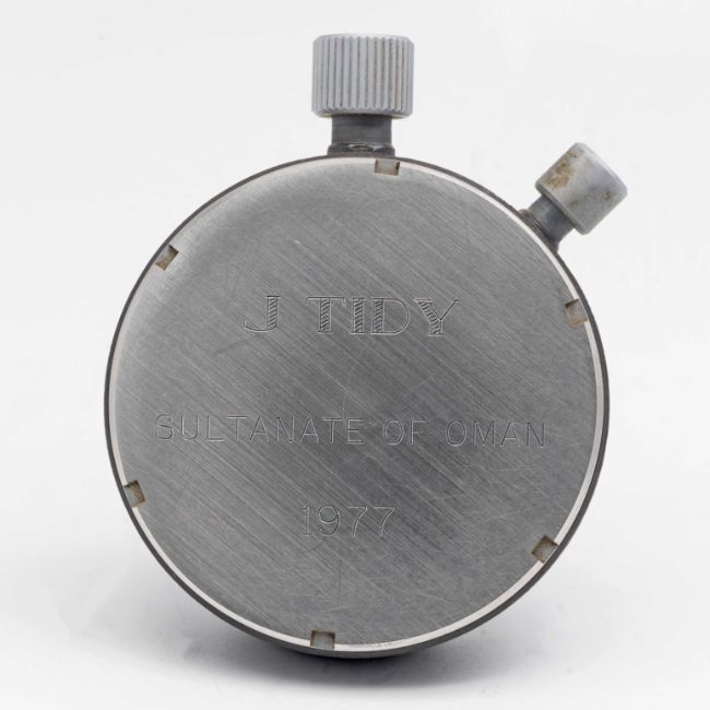 A RARE OMEGA STOP WATCH TIMER POCKET WATCHDATED 1977, THE WATCH WAS GIFTED BY THE SULTAN OF OMAN IN 1977 TO J.TIDY (ENGRAVED ON CASE BACK), ACCOMPANIED BY ORIGINAL BOX, PAPERWORK & PURCHASE RECEIPTMovement: 7J, manual wind, cal. 8260A, signed Omega, numbered 3,2xx,xxx.Case: Diameter approx. 54mm excluding the crown & pusher.CONDITION REPORTDial: Original dial in excellent condition.Movement: Running & functioning at present, timekeeping and accuracy cannot be guaranteed.Case: In very good condition, with some scratches due to general use. The plexi glass is cracked around the 15-20 seconds mark.
