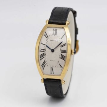 A GENTLEMAN'S 18K SOLID GOLD CARTIER PARIS CINTREE TONNEAU WRIST WATCHCIRCA 1990sMovement: Manual wind, signed Cartier.Case:  Approx. 45.5mm by 26mm, signed Cartier Paris, 18K hallmarks, numbered, original sapphire crown.Strap: Cartier leather strap & pin buckle.CONDITION REPORTDial: Original dial in very good condition, showing small signs of ageMovement: Running & functioning at present, timekeeping and accuracy cannot be guaranteed.Case: In very good condition, with some scratches and wear due to general use.Strap/Bracelet: In fair condition.