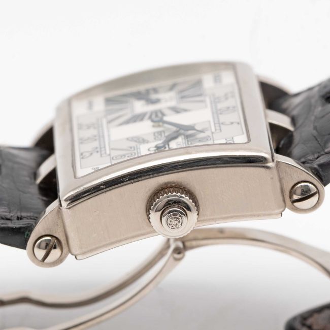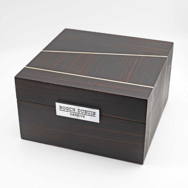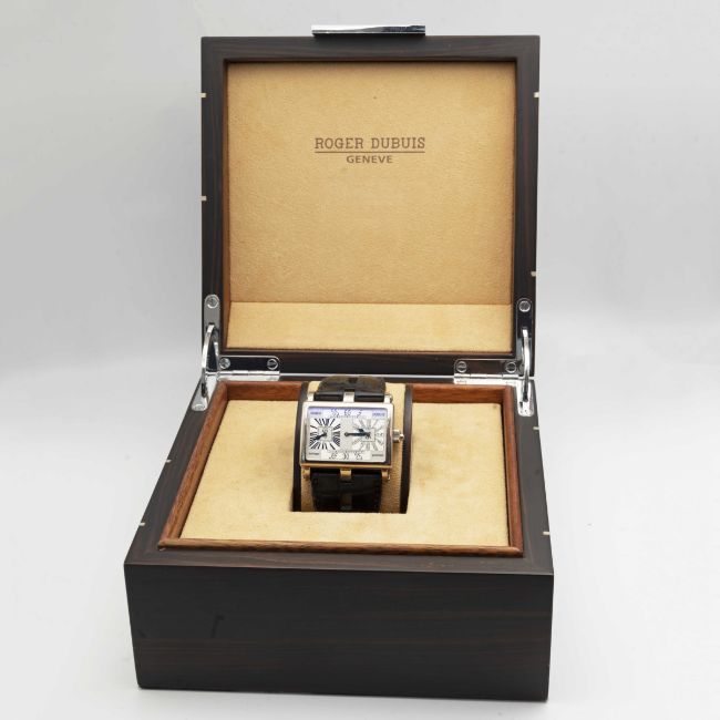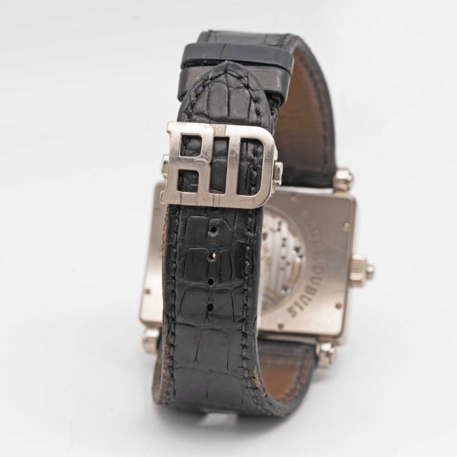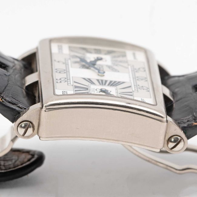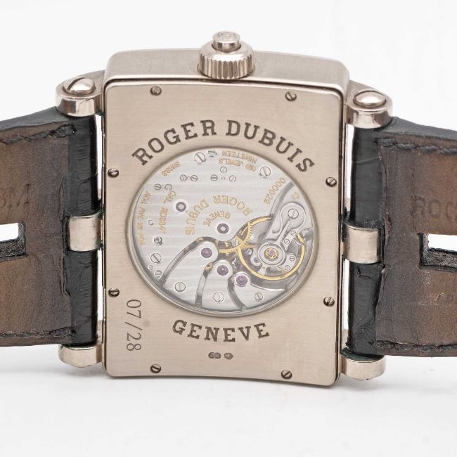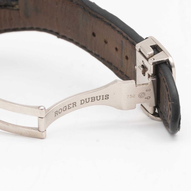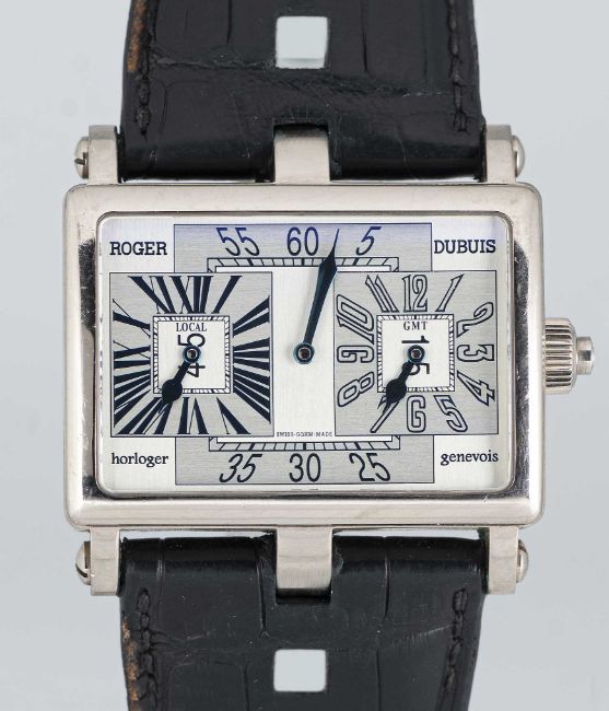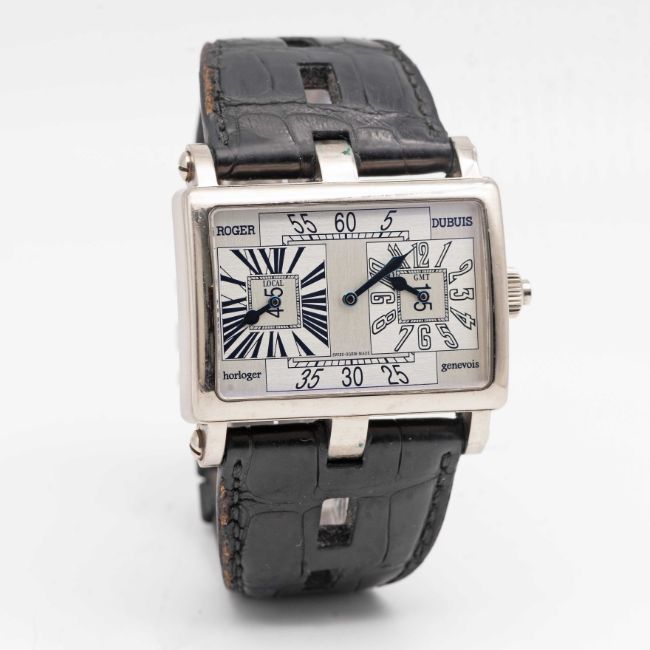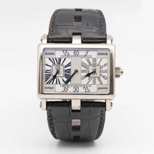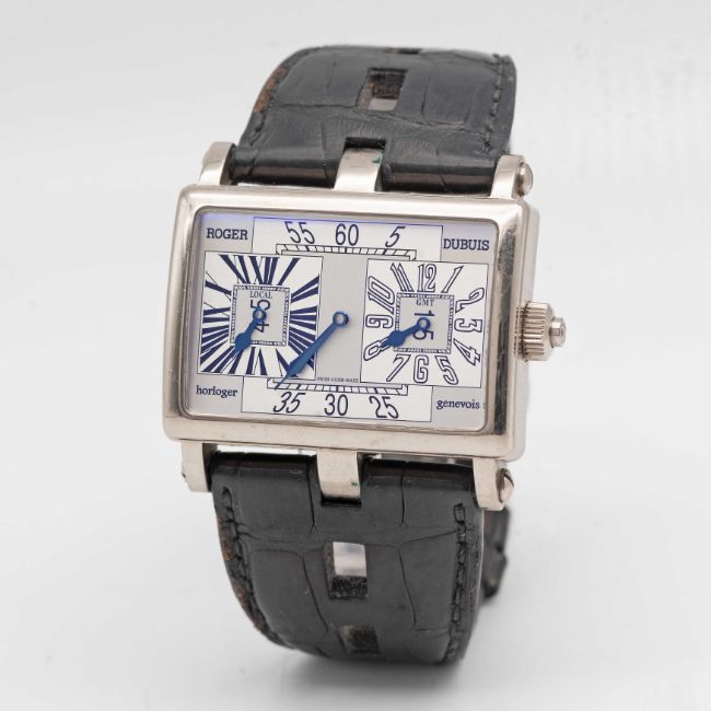 A RARE GENTLEMAN'S 18K SOLID WHITE GOLD ROGER DUBUIS "TOO MUCH" DUAL TIME GMT WRIST WATCHCIRCA 2000, LIMITED EDITION OF 28 PIECES WITH MANUAL WIND MOVEMENT, ACCOMPANIED BY ROGER DUBUIS BOXMovement: 19J, manual wind, cal. RD9847, signed Roger Dubuis Geneve, numbered.Case: Width approx. 43mm, exhibition case back, signed Roger Dubuis Geneve, 18k hallmarks, limited number, original RD crown.Strap: Roger Dubuis leather strap & 18k solid white gold deployment clasp.CONDITION REPORTDial: Original dial in excellent condition.Movement: Running & functioning at present, timekeeping and accuracy cannot be guaranteed.Case: In very good condition, with some scratches and wear due to general use.Strap/Bracelet: In fair condition, deployment clasp in excellent condition.