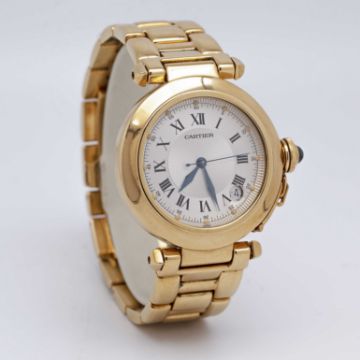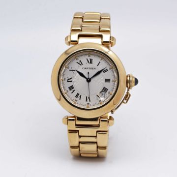 A GENTLEMAN'S SIZE 18K SOLID YELLOW GOLD CARTIER PASHA AUTOMATIC BRACELET WATCHCIRCA 1990s, REF. 820901 WITH ORIGINAL BOX, BOOKLET & OPEN PAPERWORKMovement: Automatic, signed Cartier.Case: Diameter approx. 38mm, signed Pasha de Cartier, 18k hallmarks, numbered, original sapphire crown guard.Bracelet: Original Cartier Pasha 18k solid yellow gold bracelet.CONDITION REPORTDial: Original dial in excellent condition.Movement: Running & functioning at present, timekeeping and accuracy cannot be guaranteed.Case: In very good condition, with some scratches due to general use.Strap/Bracelet: In very good condition.