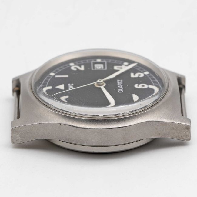 A VERY RARE GENTLEMAN'S STAINLESS STEEL BRITISH MILITARY CWC "NON LUME" NAVIGATOR WRIST WATCHDATED 1980, THIS BEING THE ONLY KNOWN EXAMPLE ISSUED IN 1980, USED BY ROYAL NAVY ONBOARD NUCLEAR SUBMARINESMovement: Quartz.Case: Diameter approx. 36mm, fixed bars, "Fatboy" case, issue markings 6645-99-541-7363 ^ 606/80.Strap: NATO.CONDITION REPORTDial: Original dial in excellent condition.Movement: Running & functioning at present, timekeeping and accuracy cannot be guaranteed.Case: In excellent condition, with some small scratches due to use.Strap/Bracelet: In excellent condition.