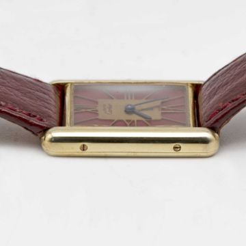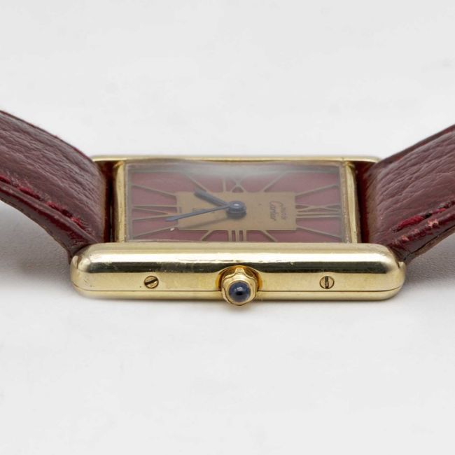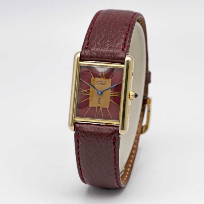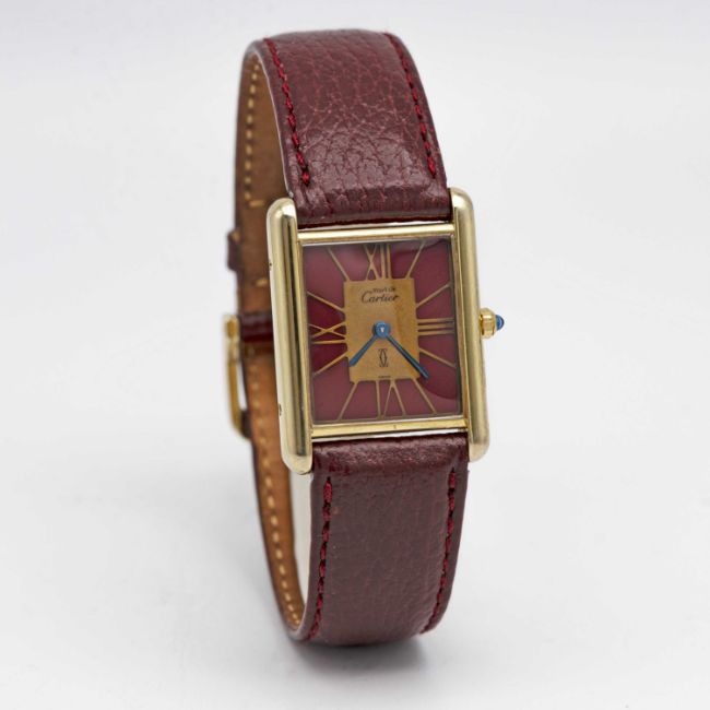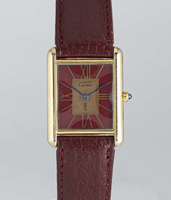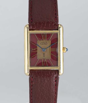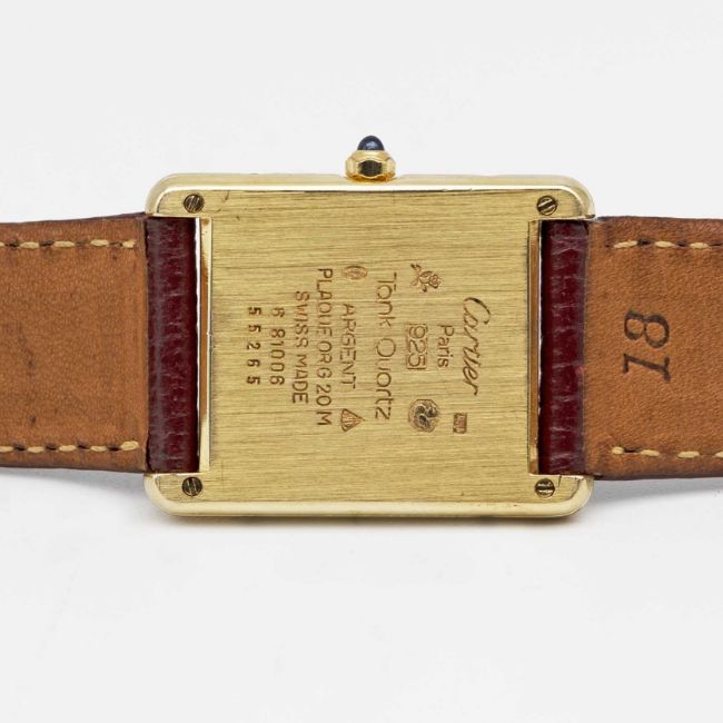A SOLID SILVER GILT MUST DE CARTIER TANK WRIST WATCHCIRCA 1980s, REF. 55265Movement: Quartz, signed Cartier.Case: Measures approx. 30.5mm by 23.5mm, signed Cartier Paris, silver hallmarks, numbered, sapphire crown.Strap: Leather.CONDITION REPORTDial: Original dial in good condition, showing some signs of age.Movement: Running & functioning at present, timekeeping and accuracy cannot be guaranteed.Case: In very good condition, with some light scratches due to general use.Strap/Bracelet: In very good condition.