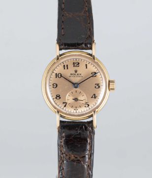 A LADIES 18K SOLID GOLD ROLEX WRIST WATCHCIRCA 1954, REF. 4241Movement: 17J, manual wind, signed Rolex.Case: Diameter approx. 23.2mm, signed Rolex 31 Victoires, serial no. 67,xxx, 18k hallmarks, Rolex crown.Strap: Rolex leather strap with Lic pin buckle.CONDITION REPORTDial: Refinished dial in very good condition, showing small signs of age.Movement: Running & functioning at present, timekeeping and accuracy cannot be guaranteed.Case: In good condition, with some scratches due to general use.Strap/Bracelet: In good condition.