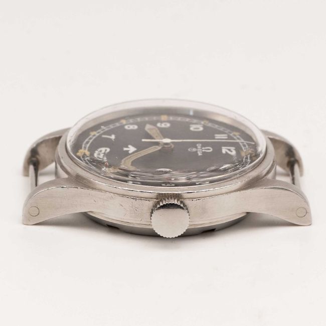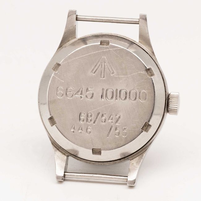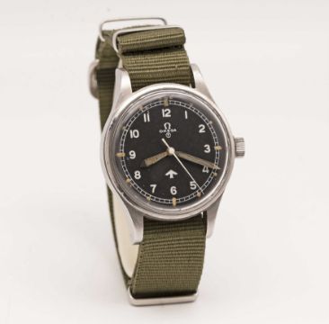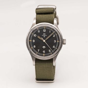 A GENTLEMAN'S STAINLESS STEEL BRITISH MILITARY OMEGA RAF PILOTS WRIST WATCHDATED 1953, REF. 2777-1 SC WITH "FAT ARROW" DIALMovement: 17J, manual wind, cal. 283, signed Omega, numbered 12,9xx,xxx.Case: Diameter approx. 37mm, fixed bars, screw back, signed Omega Watch Co, issue markings ^ 6645 101000 6B/542 446/53, dust cover & ring, original crown.Strap: NATO.CONDITION REPORTDial: Original MOD dial in very good condition, showing some small signs of age.Movement: Running & functioning at present, timekeeping and accuracy cannot be guaranteed.Case: In good condition, with some scratches due to general use.Strap/Bracelet: In excellent condition.
