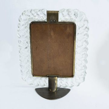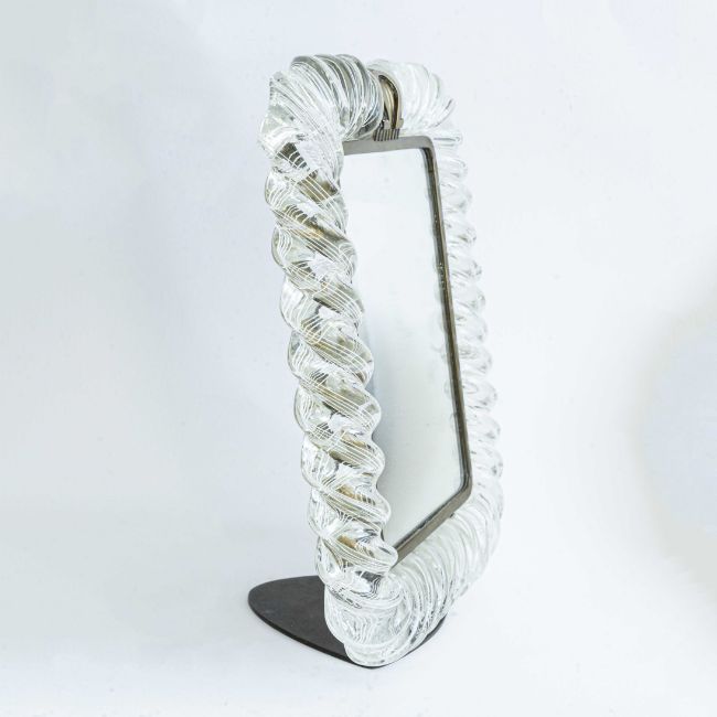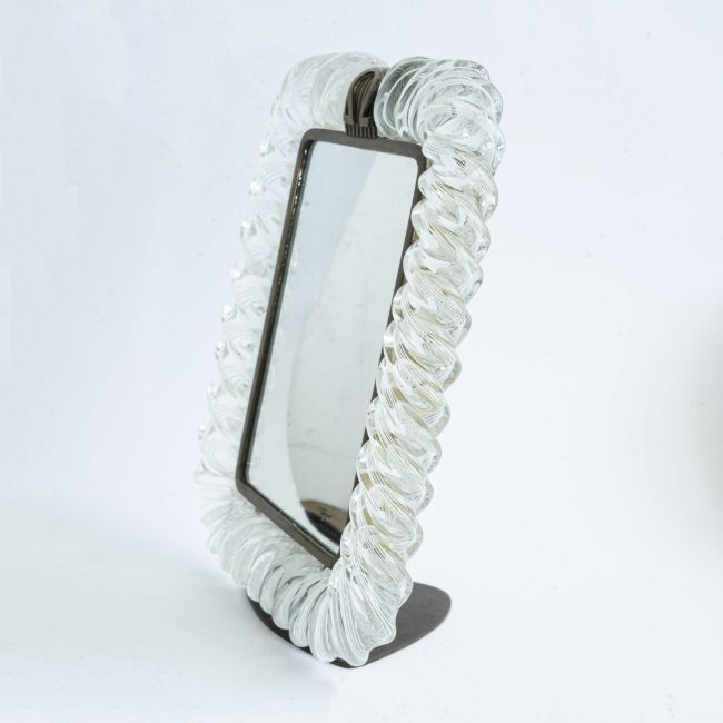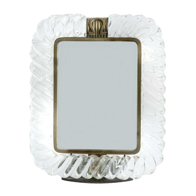 A RARE ITALIAN GLASS "TRECCIA" OMEGA SHOP DISPLAY MIRRORCIRCA 1950s BY MURANO, GLASS MASTERS VENINIWhite filligrina decorated braided clear glass frame with brass mounts and stand.Measures approx 33cm by 26cm.CONDITION REPORTIn excellent condition. No damage to the glass surround.