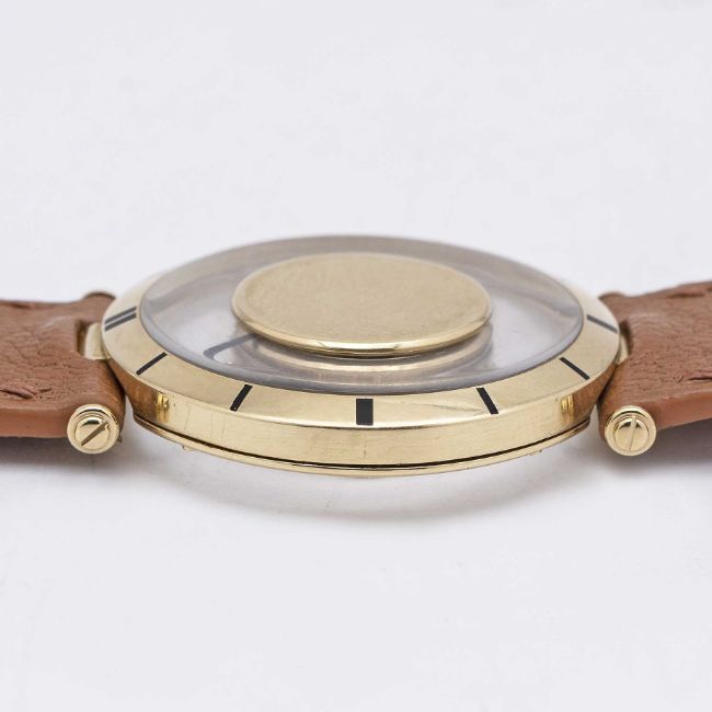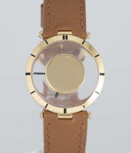 A RARE GENTLEMAN'S 18K SOLID GOLD CARTIER "MYSTERY" WRIST WATCHCIRCA 1950, WITH CARTIER SIGNED MOVEMENTMovement: Manual 'back' wind, signed Cartier.Case: Diameter approx. 32mm, numbered, 18k hallmarks, original crown.Strap: Leather strap with 18k solid gold Cartier pin buckle.CONDITION REPORTDial: Original dial in excellent condition.Movement: Running & functioning at present, timekeeping and accuracy cannot be guaranteed.Case: In good condition, with some scratches and wear due to general use.Strap/Bracelet: In excellent condition.