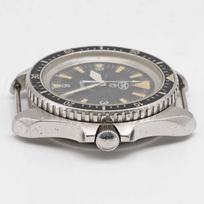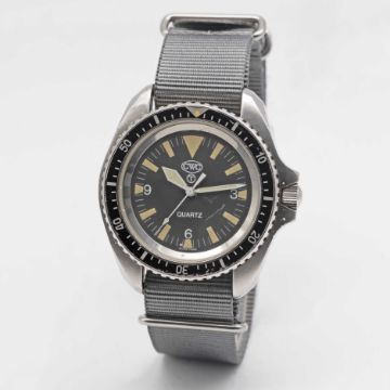 A GENTLEMAN'S STAINLESS STEEL BRITISH MILITARY CWC ROYAL NAVY DIVERS WRIST WATCHDATED 1995 Movement: Quartz, ETA cal. 955122.Case: Diameter approx. 42mm, fixed bars, screw back, issue markings 0555/6645-99-7573314 ^ 457 95, 60 minute rotating bezel, dust cover, screw-down crown.Strap: NATO.CONDITION REPORTDial: Original dial in excellent condition.Movement: Running & functioning at present, timekeeping and accuracy cannot be guaranteed.Case: In good condition, with some scratches due to use, paint specs on the case, scratches to the glass.Strap/Bracelet: In excellent condition.