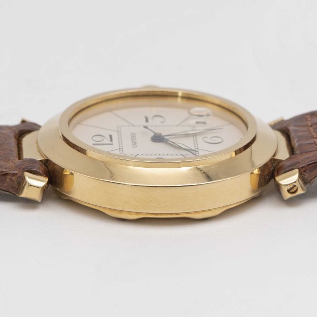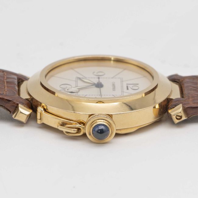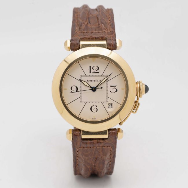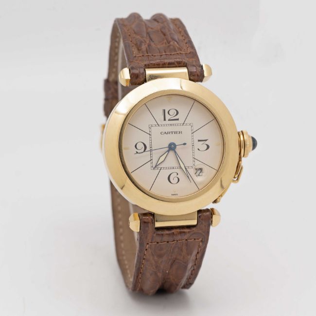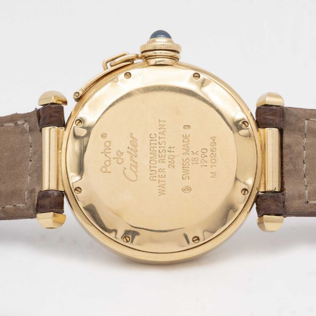 A GENTLEMAN'S SIZE 18K SOLID GOLD CARTIER PASHA AUTOMATIC WRIST WATCHCIRCA 1990s, REF. 1990Movement: Automatic, signed Cartier.Case: Diameter approx. 38mm, signed Pasha de Cartier, 18K hallmarks, numbered, original Cartier sapphire crown guard.Strap: Cartier leather strap with 18k solid gold Cartier pin buckle.CONDITION REPORTDial: Original dial in excellent condition.Movement: Running & functioning at present, timekeeping and accuracy cannot be guaranteed.Case: In very good condition, with some light scratches due to general use.Strap/Bracelet: In excellent condition.