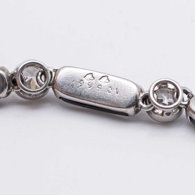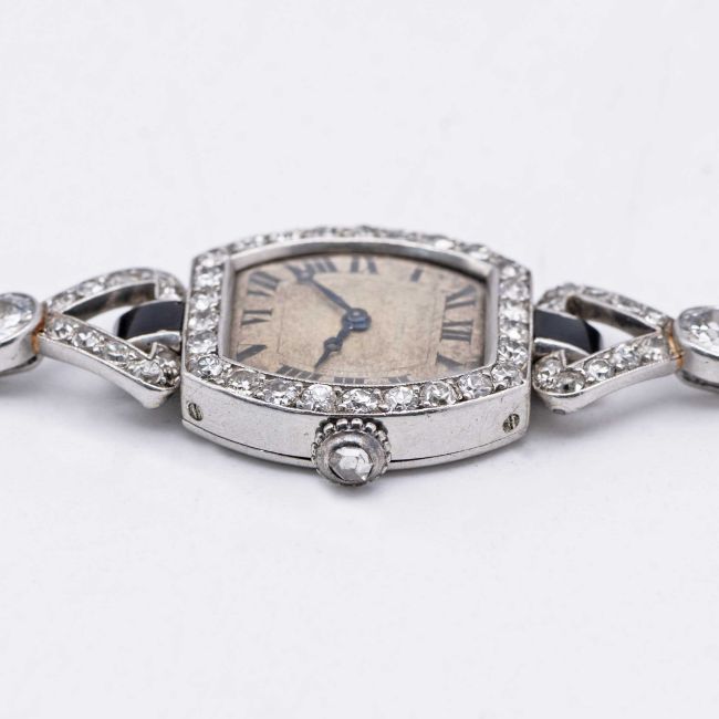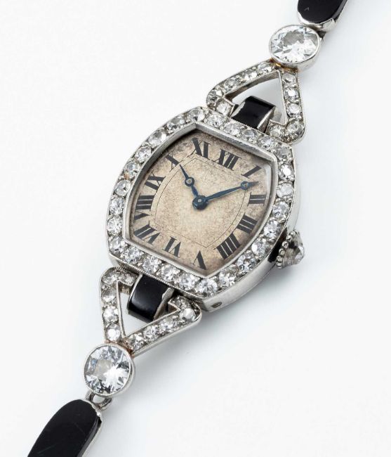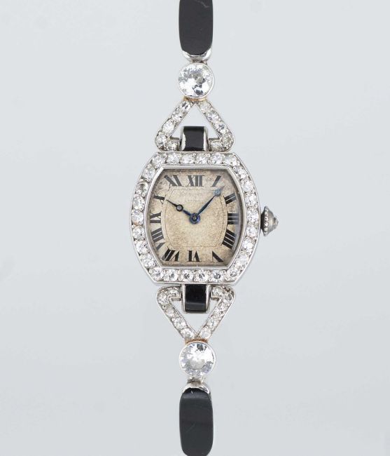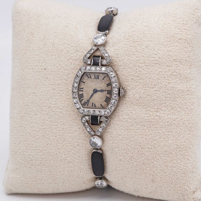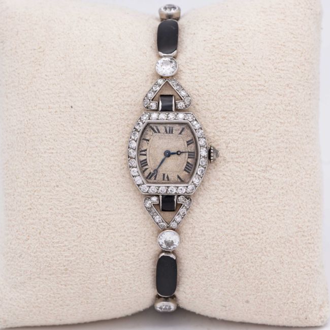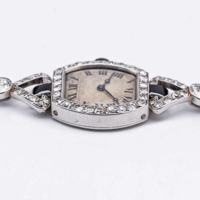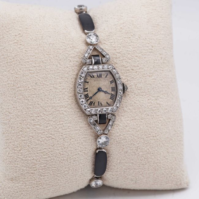 A FINE & RARE LADIES PLATINUM, DIAMOND & ONYX CARTIER COCKTAIL BRACELET WATCHCIRCA 1920s, WITH MATCHING NUMBERS ON THE CASE & BRACELETMovement: 18J, manual wind, original unsigned.Case: Measures approx. 43.4mm (including the lugs) by 18mm, French "dogs head" platinum hallmark on case & bracelet, two sets of numbers on the case back, diamond set crown.Bracelet: Original platinum, diamond & onyx bracelet.CONDITION REPORTDial: Original dial in poor condition, showing signs of age.Movement: Running & functioning at present, timekeeping and accuracy cannot be guaranteed.Case: In very good condition, with some scratches & wear due to general use.Strap/Bracelet: In very good condition.