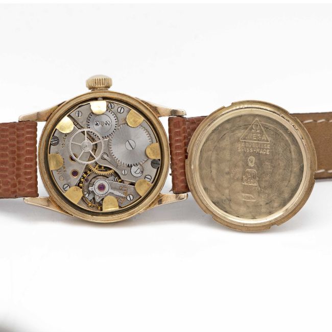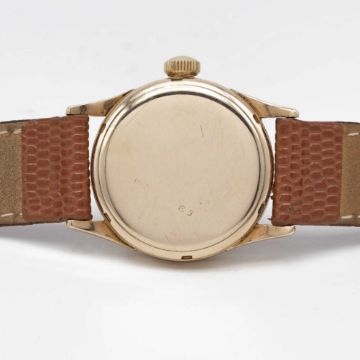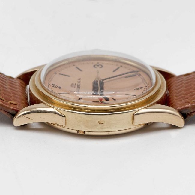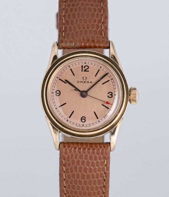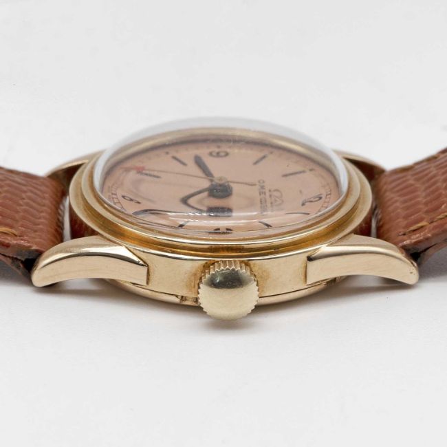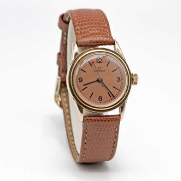 A GENTLEMAN'S SMALL SIZE 14K SOLID GOLD OMEGA WRIST WATCHCIRCA 1939, WITH SALMON DIALMovement: 15J, manual wind, cal. 23.4 SC, signed Omega, numbered 9,0xx,xxx.Case: Diameter approx. 28mm, screw back, signed Omega, Fab Suisse, 14K hallmarks.Strap: Leather.CONDITION REPORTDial: Original dial in excellent condition.Movement: Running & functioning at present, timekeeping and accuracy cannot be guaranteed.Case: In very good condition, with some scratches and wear due to general use.Strap/Bracelet: In very good condition.