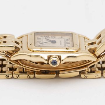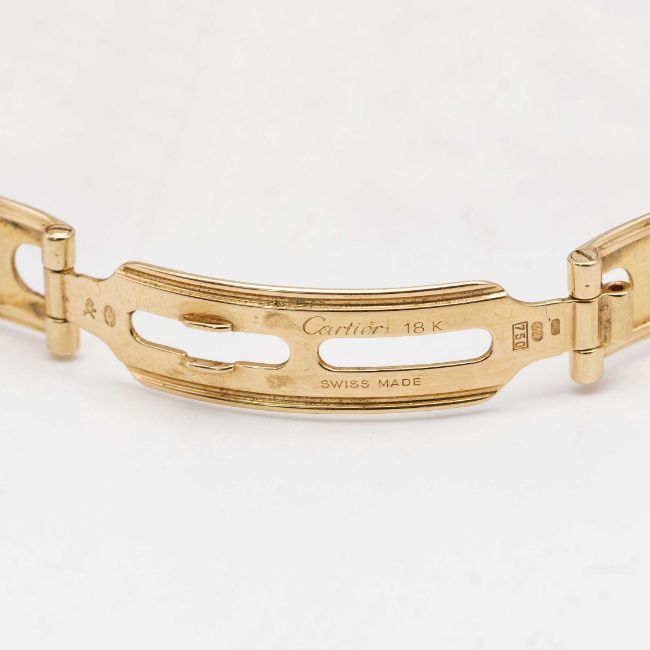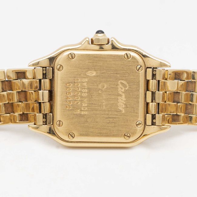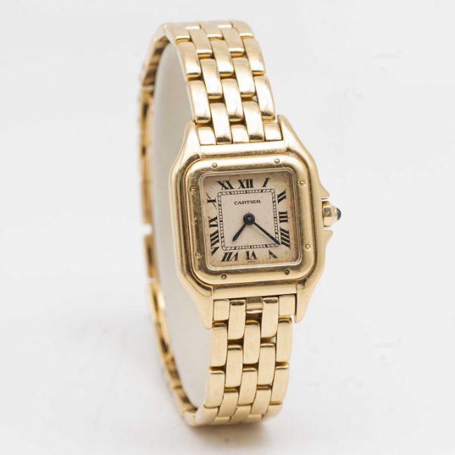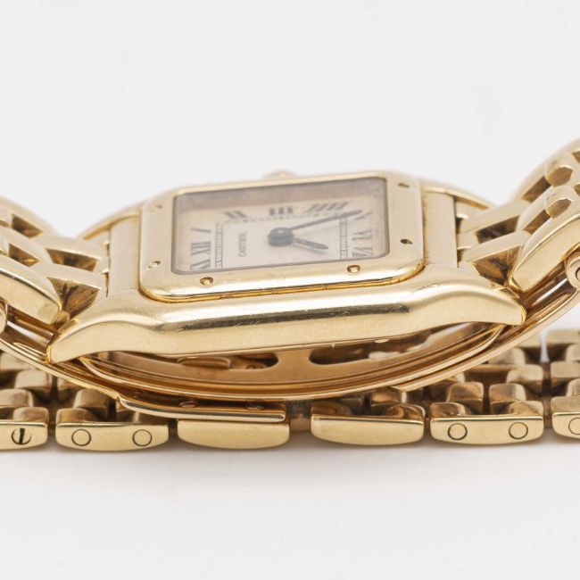 A LADIES 18K SOLID GOLD CARTIER PANTHERE BRACELET WATCHCIRCA 1990, REF. 107000M WITH CARTIER BOXMovement: Quartz, signed Cartier.Case: Width approx. 22mm, signed Cartier, numbered, 18k hallmarks, sapphire crown.Bracelet: Original 18k solid gold Cartier Panthere bracelet.CONDITION REPORTDial: Original dial in fair condition, showing signs of age.Movement: Running & functioning at present, timekeeping and accuracy cannot be guaranteed.Case: In good condition, with some scratches and wear due to general use.Strap/Bracelet: In very good condition with some scratches and wear due to general use.