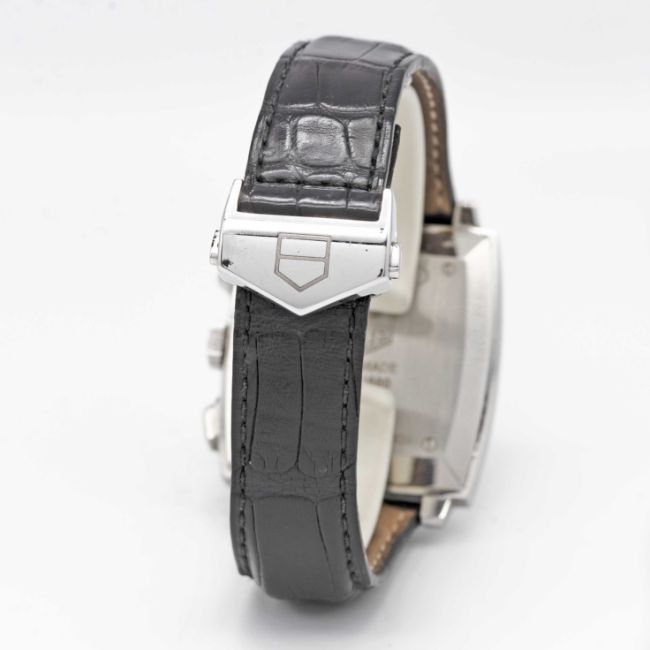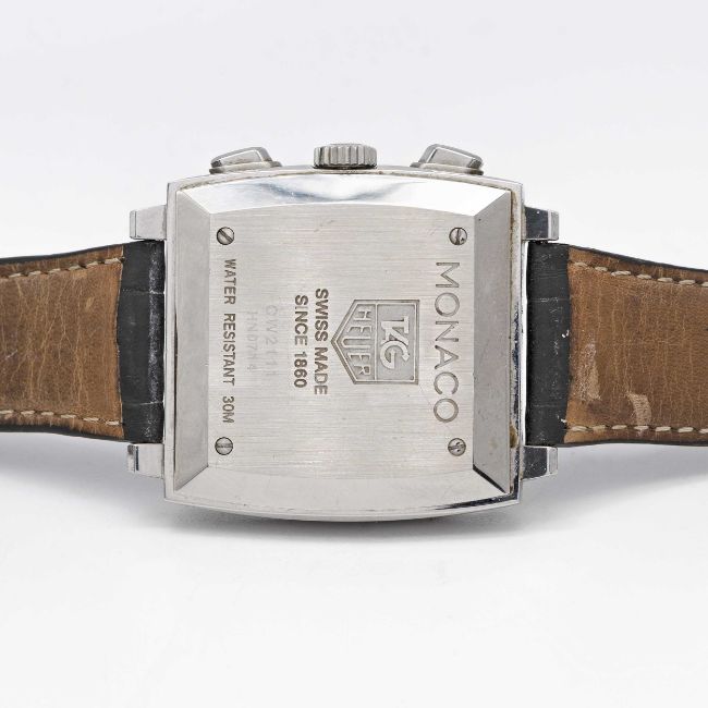 A GENTLEMAN'S STAINLESS STEEL TAG HEUER MONACO AUTOMATIC CHRONOGRAPH WRIST WATCHCIRCA 2005, REF. CW2111 WITH TAG HEUER BOX & OPEN GUARANTEE CARDMovement: Automatic, signed TAG Heuer.Case: Width approx. 38mm, signed TAG Heuer Monaco, numbered, TAG Heuer crown & pushers.Strap: Leather strap with a Tag Heuer deployment clasp.CONDITION REPORTDial: Original dial in excellent condition.Movement: Running & functioning at present, timekeeping and accuracy cannot be guaranteed.Case: In very good condition, with some scratches due to general use.Strap/Bracelet: In fair condition.The box inner is in poor condition.