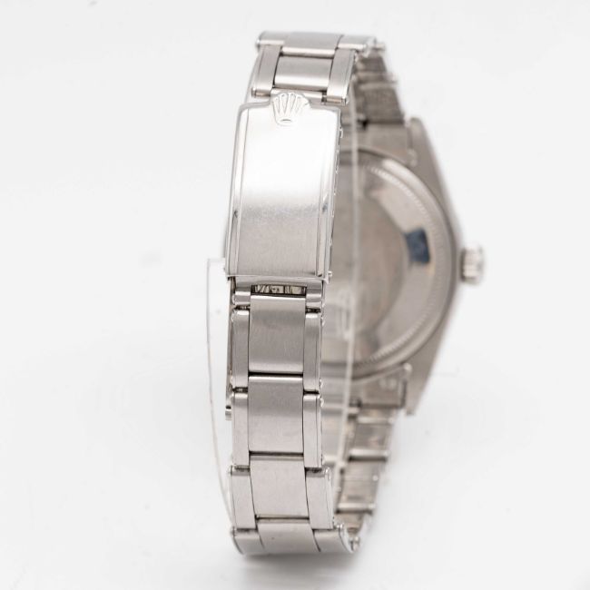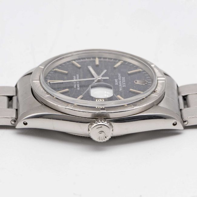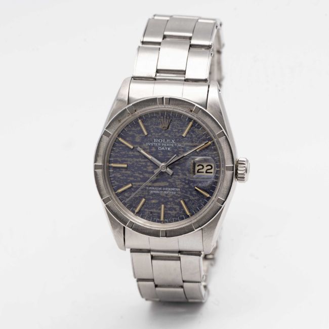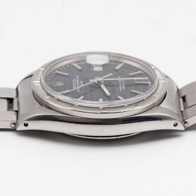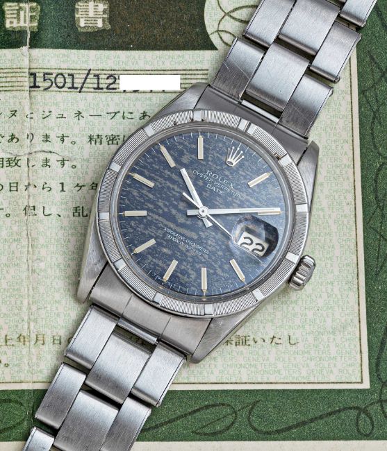 A GENTLEMAN'S STAINLESS STEEL ROLEX OYSTER PERPETUAL DATE BRACELET WATCHCIRCA 1966, REF. 1501 WITH "DISTRESSED DENIM" DIAL, ACCOMPANIED ORIGINAL GUARANTEE PAPERWORKMovement: 26J, automatic chronometer, cal. 1570, signed Montres Rolex S.A., numbered.Case: Diameter approx. 34.5mm, Oyster case, milled bezel, signed Montres Rolex S.A., serial no. 1,2xx,xxx, Rolex crown.Bracelet: Original Rolex Oyster riveted bracelet, numbered 7205/60, dated 1/66.CONDITION REPORTDial: Original dial in very good "distressed" condition, dial from slightly later period to the watch.Movement: Running & functioning at present, timekeeping and accuracy cannot be guaranteed.Case: In very good condition, with light scratches & wear due to general use.Strap/Bracelet: In good condition, with light scratches & wear.