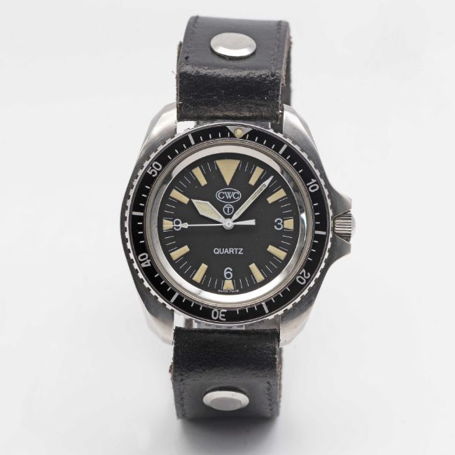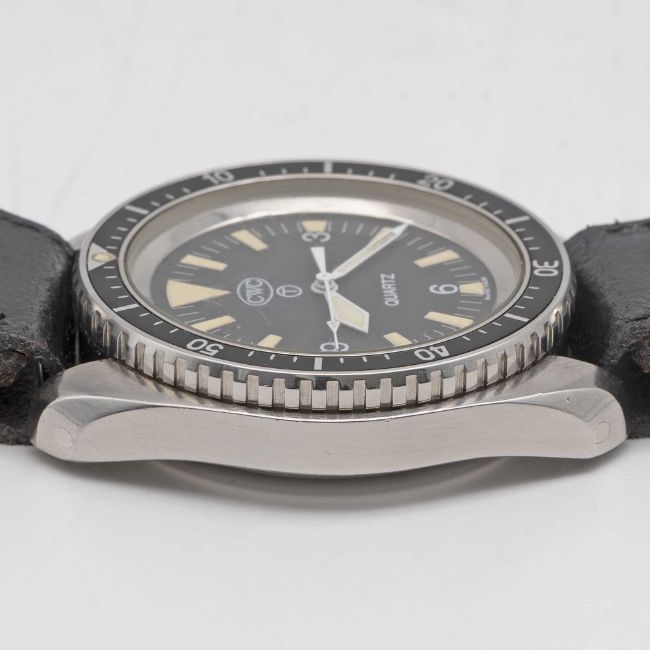 A GENTLEMAN'S STAINLESS STEEL BRITISH MILITARY CWC ROYAL NAVY DIVERS WRIST WATCHCIRCA 1990s, WITH SP MARKINGSMovement: Quartz.Case: Diameter approx. 42mm, fixed bars, screw back, issue markings 0555/6645-99-7573314 ^ SP, 60 minute rotating bezel, dust cover, screw-down crown.Strap: Leather.CONDITION REPORTDial: Original dial in excellent condition, showing some very small signs of age.Movement: Running & functioning at present, timekeeping and accuracy cannot be guaranteed.Case: In very good condition, with some small scratches due to use.Strap/Bracelet: In excellent condition.