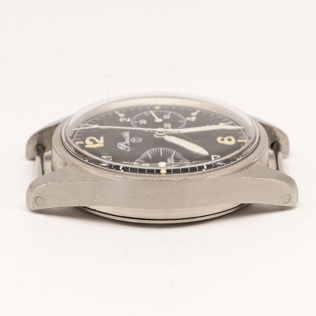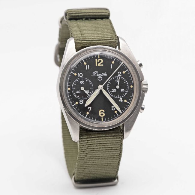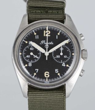 A RARE GENTLEMAN'S STAINLESS STEEL BRITISH MILITARY PRECISTA RAF PILOTS CHRONOGRAPH WRIST WATCHDATED 1981, PART OF THE "FAB FOUR"Movement: 17J, manual wind, Valjoux cal. 7733, signed Gallet & Co.Case: Diameter approx. 39mm, fixed bars, screw back, issue markings 6BB/924-3306 ^ 1019/81. Strap: NATO.CONDITION REPORTDial: Original dial in excellent condition, showing some small signs of age. Movement: Running & functioning at present, timekeeping and accuracy cannot be guaranteed.Case: In excellent condition, with light scratches due to use.Strap: In excellent condition.