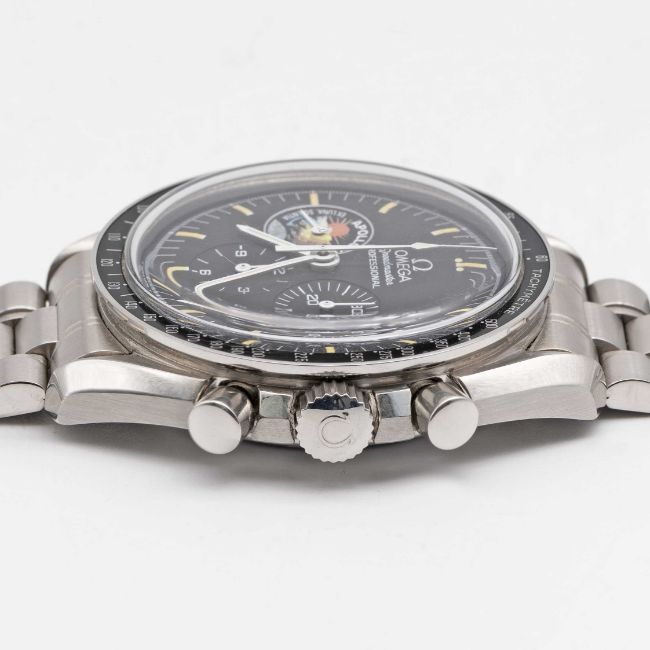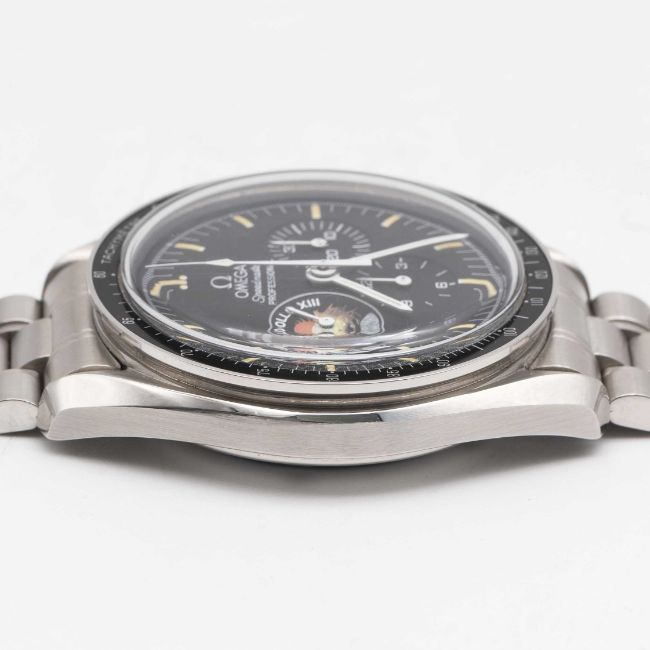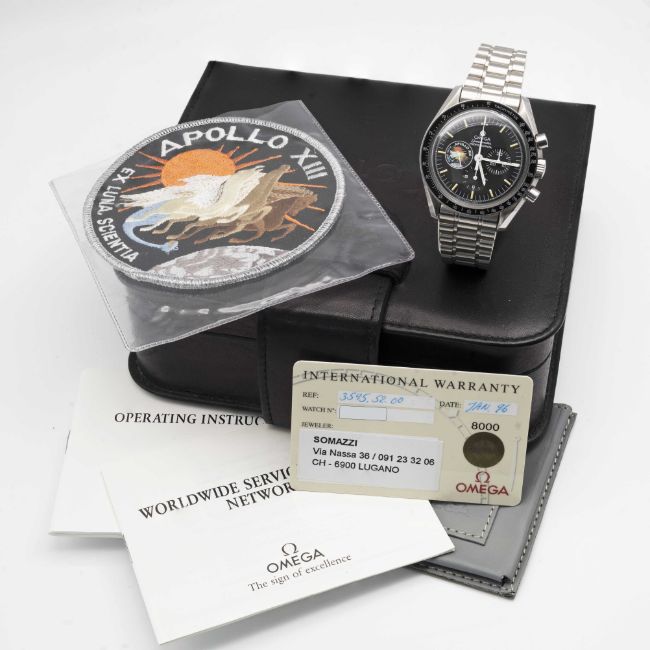 A RARE GENTLEMAN'S STAINLESS STEEL OMEGA SPEEDMASTER PROFESSIONAL APOLLO XIII CHRONOGRAPH BRACELET WATCHDATED 1996, REF. 3595.52.00 APOLLO 13 25TH ANNIVERSARY LIMITED EDITON OF 999 PIECES, ACCOMPANIED BY ORIGINAL OMEGA BOX, WARRANTY CARD, BOOKLETS & MISSION PATCH Movement: Manual wind, cal. 861, signed Omega, numbered 48,3xx,xxx. Case: Diameter approx. 42mm, screw back, Speedmaster emblem embossed with NASA moon landing tribute, engraved with Apollo 13 Limited Series 2xx/999, dust cover, tachymetre bezel, Omega crown.Bracelet: Original Omega Speedmaster bracelet, numbered (32) 1479/812.CONDITION REPORTDial: Original dial in excellent condition.Movement: Running & functioning at present, timekeeping and accuracy cannot be guaranteed.Case: In excellent condition.Strap/Bracelet: In excellent condition.Overall it appears the watch has been rarely worn from new.