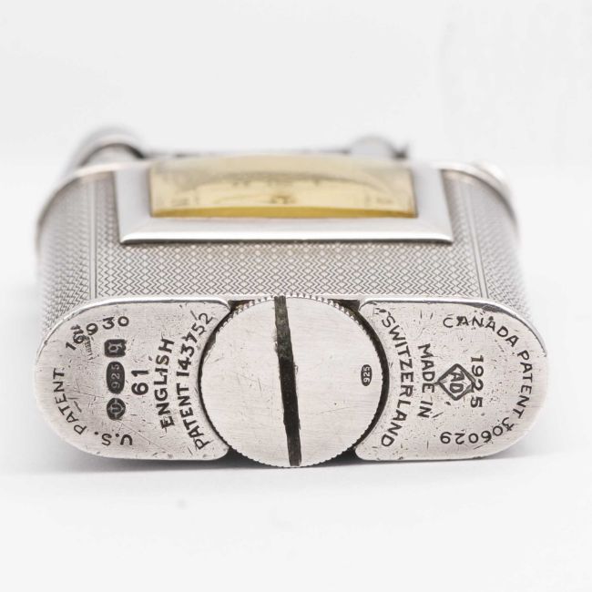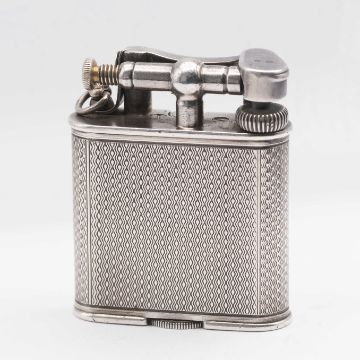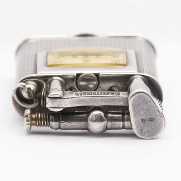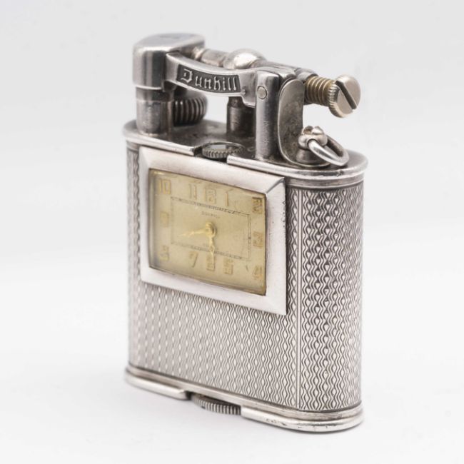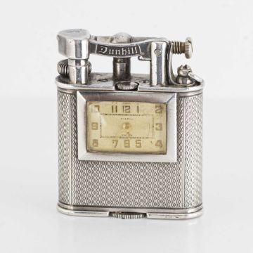 A RARE SOLID SILVER DUNHILL UNIQUE 'A' SELF WINDING WATCH LIGHTERCIRCA 1930sMovement: Manual wind through the crown or self winding through snuffer arm, signed Dunhill.Case: Approx. 46mm by 38mm by 13.4mm, signed Dunhill, numbered, silver hallmark letter (q), patent numbers.CONDITION REPORTDial: Original dial in good condition, showing signs of age.Movement: Running & functioning at present, timekeeping and accuracy cannot be guaranteed.Case: In excellent condition, with some light scratches due to general use. Plexi glass has turned yellow.