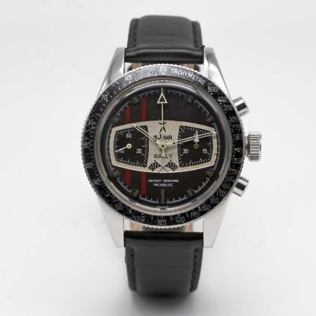 A GENTLEMAN'S STAINLESS STEEL LEJOUR RALLY CHRONOGRAPH WRIST WATCHCIRCA 1969Movement: 17J, manual wind, Valjoux cal. 7730, signed Continental Time Co France. Case: Diameter approx. 39mm, screw back, ref. 9312, signed Continental Time Co France, numbered 31x,xxx, tachymetre bezel, "big" crown. Strap: Leather.CONDITION REPORTDial: Original dial in good condition, showing some signs of age.Movement: Running & functioning at present, timekeeping and accuracy cannot be guaranteed.Case: In good condition, with some light scratches due to general use.Strap/Bracelet: In excellent condition.