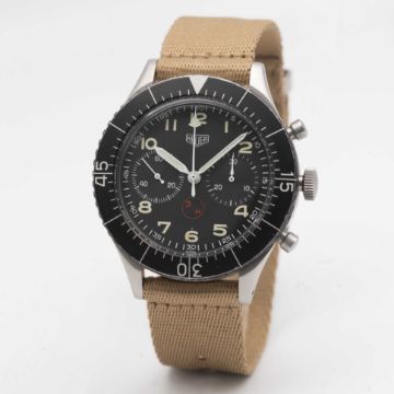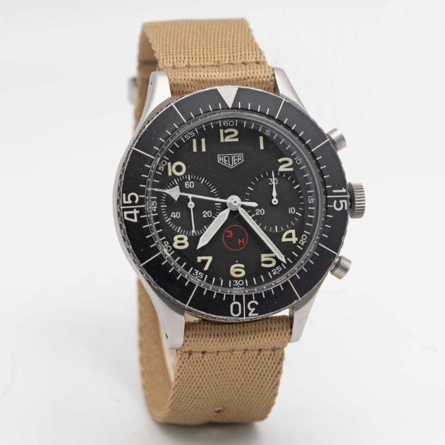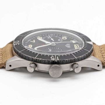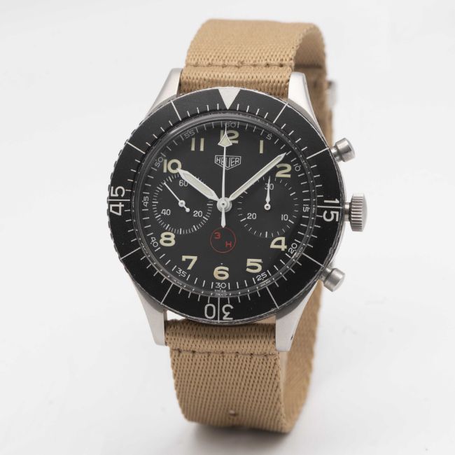 A GENTLEMAN'S STAINLESS STEEL GERMAN MILITARY HEUER BUND FLYBACK CHRONOGRAPH WRIST WATCH CIRCA 1970, REF. 1550 SG WITH (3 H) DIAL Movement: 17J, manual wind, Valjoux cal. 230.Case: Diameter approx. 43mm, "clamshell", numbered, issue markings BUNDESWEHR 6645-12-340-9456 (6645-12-146-3774 crossed out), 60 minute rotating bezel.Strap: Textile strap.CONDITION REPORTDial: Original dial in excellent condition.Movement: Running & functioning at present, timekeeping and accuracy cannot be guaranteed.Case: In excellent condition, with some small scratches due to use.Strap/Bracelet: In excellent condition.