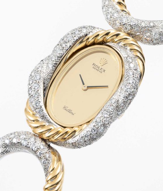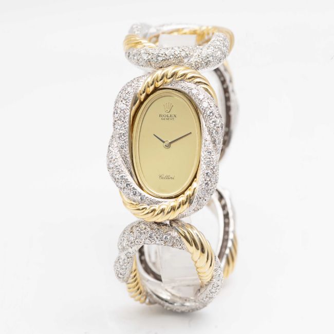 AN IMPRESSIVE & POSSIBLY UNQIUE LADIES 18K SOLID WHITE & YELLOW GOLD DIAMOND ROLEX CELLINI BRACELET WATCHCIRCA 1974, REF. 4020 WITH GOLD MIRROR DIALMovement: 19J, manual wind, cal. 1600, signed Rolex Geneva.Case: Measures approx. 29.7mm by 40.9mm, factory set diamond case, signed Montres Rolex S.A., serial no. 3,6xx,xxx, Swiss 18k hallmarks, maker's mark, Rolex crown.Bracelet: Original factory set diamond 18k solid white & yellow gold bracelet, signed Rolex SA 750, maker's mark, total length measures approx. 170mm.CONDITION REPORTDial: Original dial in good condition, showing some small signs of age.Movement: Running & functioning at present, timekeeping and accuracy cannot be guaranteed.Case: In very good condition, with some light scratches due to general use.Strap/Bracelet: In excellent condition.
