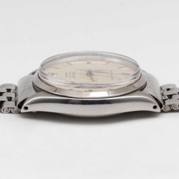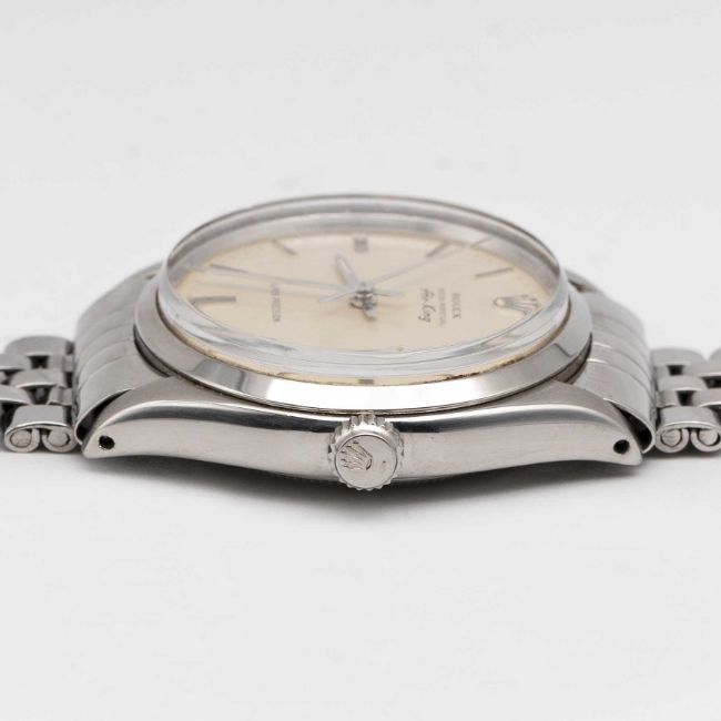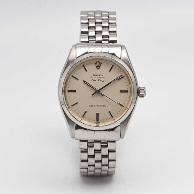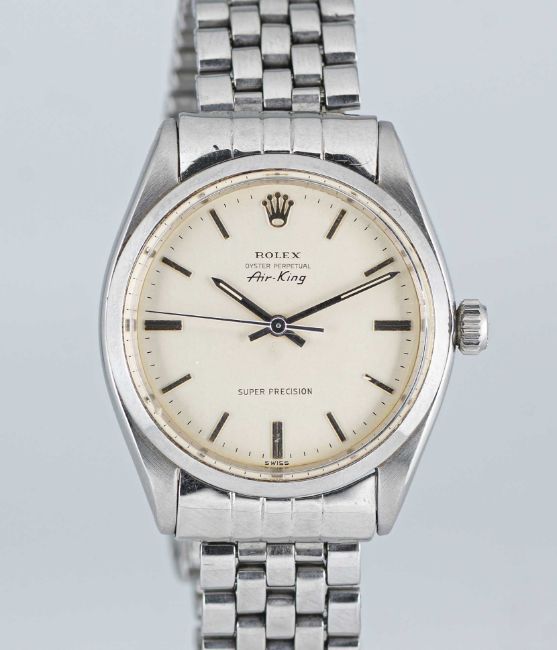 A GENTLEMAN'S STAINLESS STEEL ROLEX OYSTER PERPETUAL AIR KING SUPER PRECISION BRACELET WATCHCIRCA 1961, REF. 5500 WITH ORIGINAL ROLEX 'MADE IN ENGLAND' BRACELETMovement: 25J, automatic, cal. 1530, signed Rolex Geneva, numbered.Case: Diameter approx. 34mm, signed Montres Rolex S.A., serial no. 64x,xxx, case back dated I.61, Rolex crown.Bracelet: Original bracelet signed Rolex Made in England, end links numbered R.D.874089.CONDITION REPORTDial: Original dial in excellent condition.Movement: Running & functioning at present, timekeeping and accuracy cannot be guaranteed.Case: In very good condition, with some light scratches and wear due to general use.Strap/Bracelet: In very good condition.