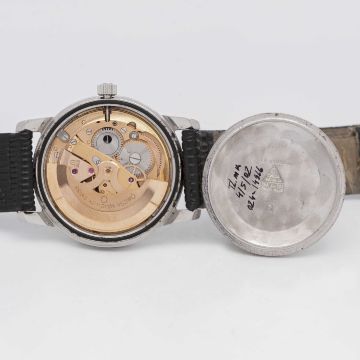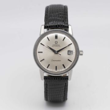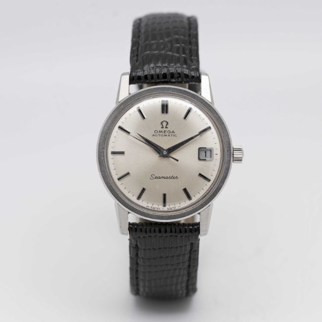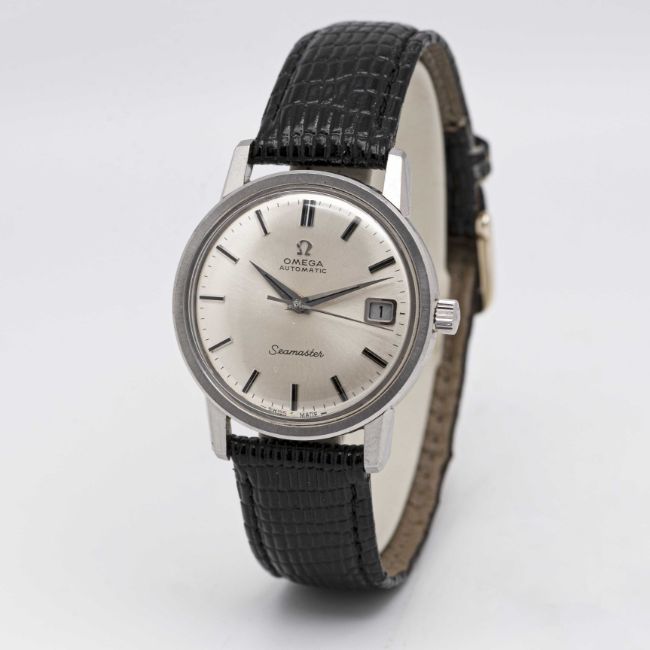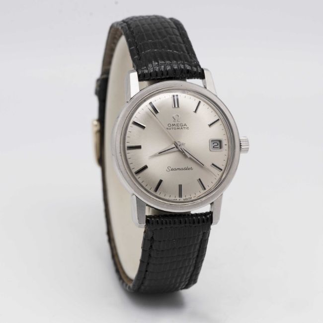 A GENTLEMAN'S STAINLESS STEEL OMEGA SEAMASTER AUTOMATIC WRIST WATCHCIRCA 1968, REF. 166.003Movement: 24J, automatic, cal. 565, signed Omega Watch Co, numbered 26,xxx,xxx.Case: Diameter approx. 34.5mm, screw back, Seamaster emblem embossed onto case back, signed Omega Watch Co, Omega crown, Omega plexiglass.Strap: Leather.CONDITION REPORTDial: Original dial in excellent condition.Movement: Running & functioning at present, timekeeping and accuracy cannot be guaranteed.Case: In very good condition, with some scratches due to general use.Strap/Bracelet: In good condition.