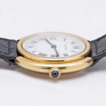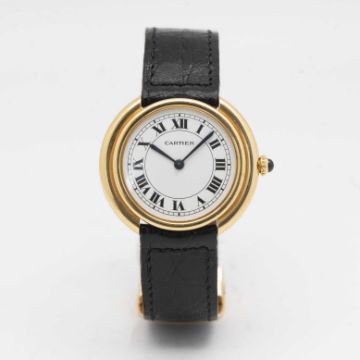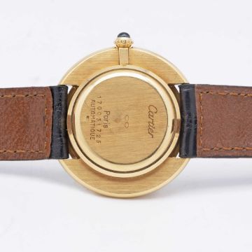 A RARE GENTLEMAN'S 18K SOLID GOLD CARTIER PARIS VENDOME "JUMBO" AUTOMATIC WRIST WATCHCIRCA 1970s, REF. 17003Movement: 17J, automatic, signed Cartier.Case: Diameter approx. 33mm, two piece case, signed Cartier Paris, 18k hallmarks, numbered, sapphire crown.Strap: Cartier leather strap & 18k sold gold deployment clasp.CONDITION REPORTDial: Original dial in excellent condition.Movement: Running & functioning at present, timekeeping and accuracy cannot be guaranteed.Case: In excellent condition, with some light scratches due to general use.Strap/Bracelet: In excellent condition, deployment clasp is in excellent condition.