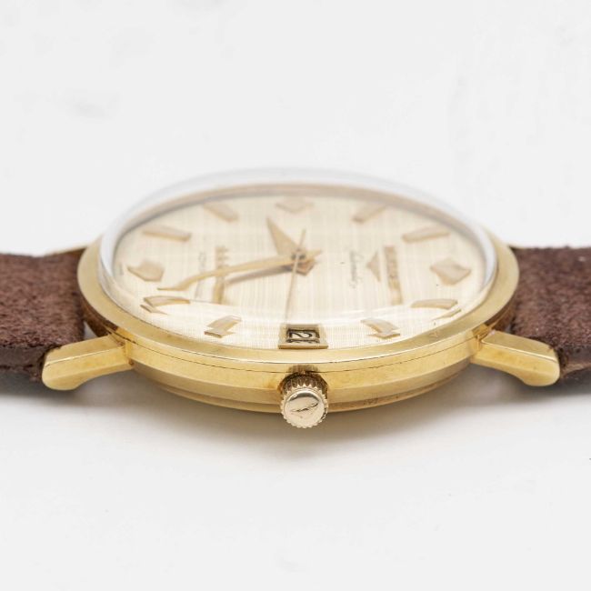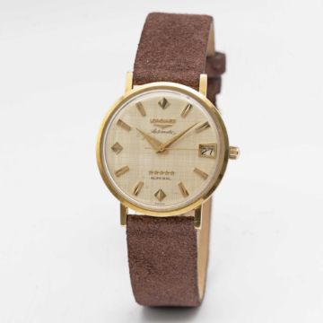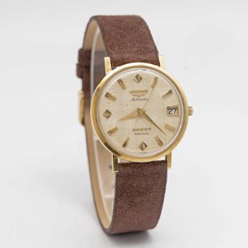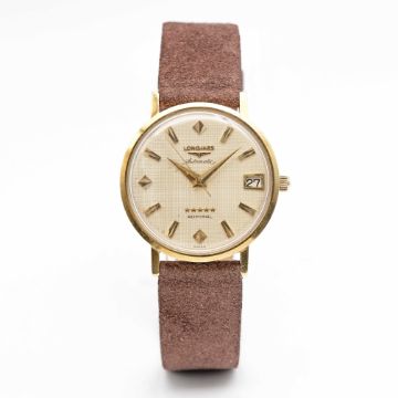 A GENTLEMAN'S 18K SOLID GOLD LONGINES ADMIRAL AUTOMATIC WRIST WATCHCIRCA 1970, WITH TEXTURED DIALMovement: Automatic, signed Longines.Case: Diameter approx. 34.5mm, two piece case, signed Longines, marked 18k gold, Longines crown.Strap: Leather.CONDITION REPORTDial: Original dial in very good condition, with some signs of age.Movement: Running & functioning at present, timekeeping and accuracy cannot be guaranteed.Case: In very good condition, with some light scratches and wear due to general use.Strap/Bracelet: In excellent condition.