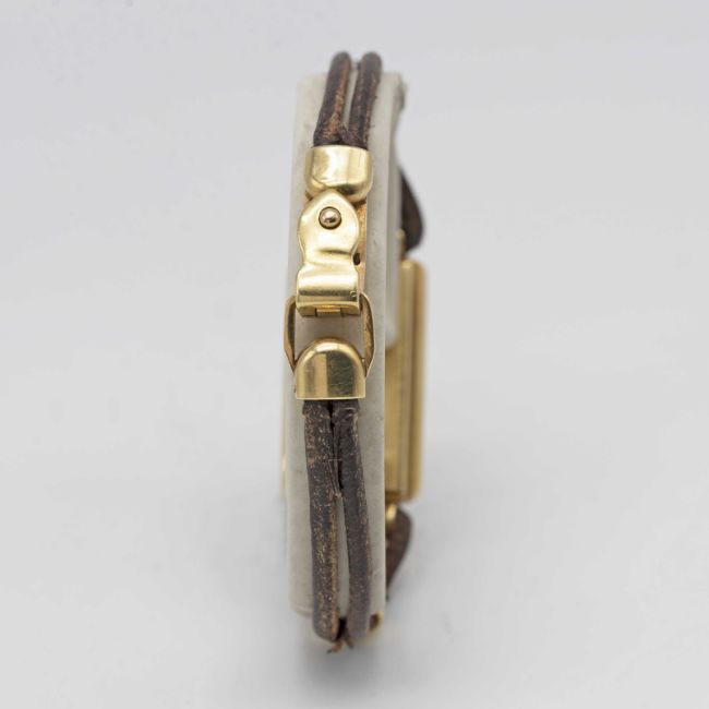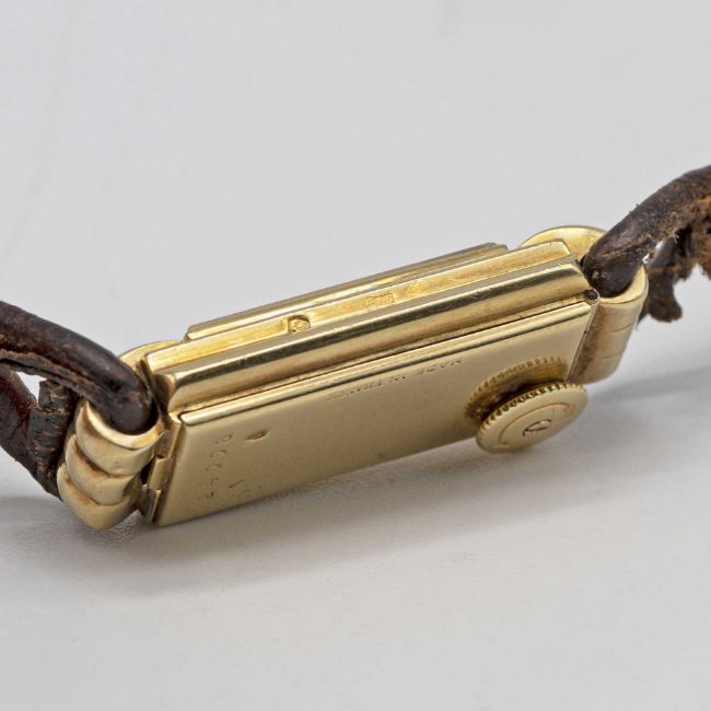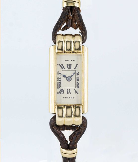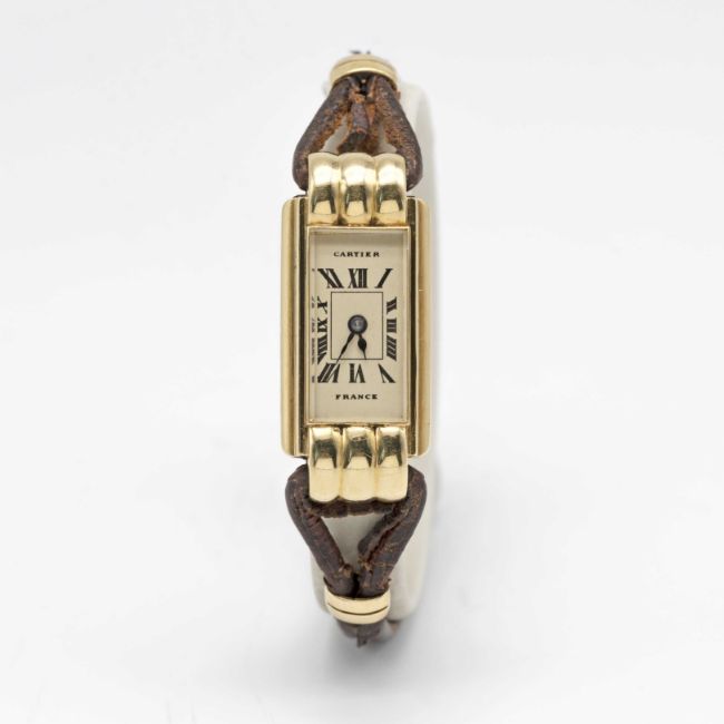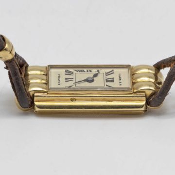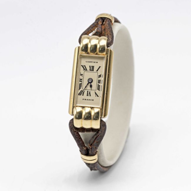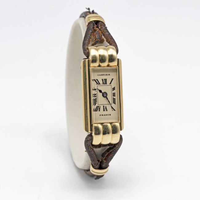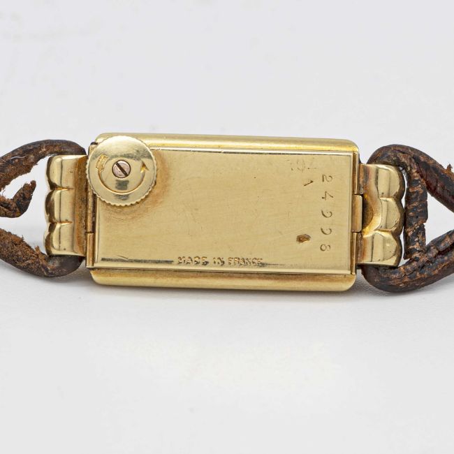 A RARE LADIES 18K SOLID GOLD CARTIER FRANCE DUOPLAN WRIST WATCHCIRCA 1930Movement: Manual back wind, cal. 409, signed Jaeger, numbered.Case: Measures approx. 34mm by 14.5mm, Made in France, 18k French hallmark, numbered, original crown.Strap: Leather strap with original 18k Cartier clasp.CONDITION REPORTDial: Original dial in excellent condition, showing a light patina.Movement: Running & functioning at present, timekeeping and accuracy cannot be guaranteed.Case: In very good condition, with some light scratches due to general use.Strap/Bracelet: In poor condition, original clasp is in very good condition.