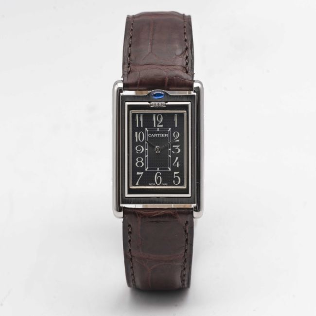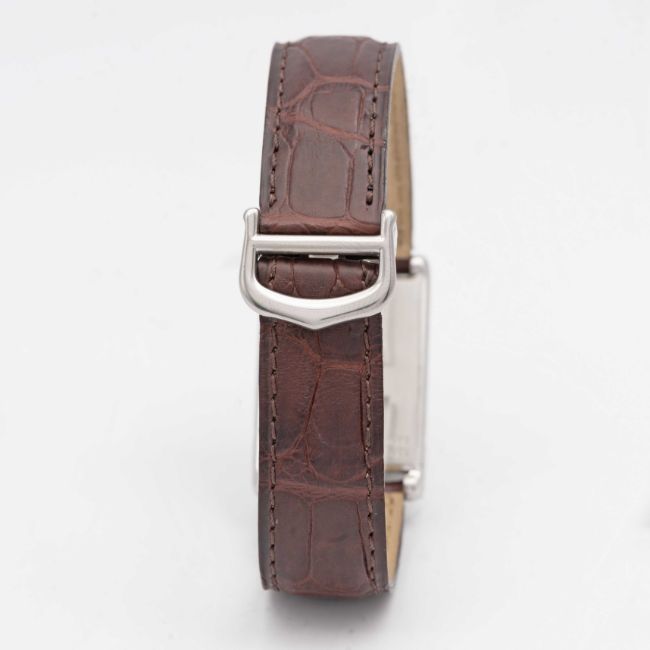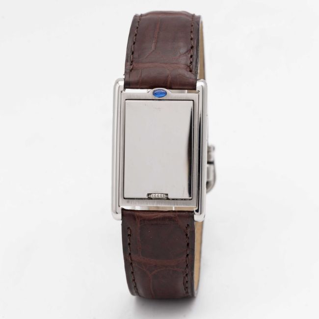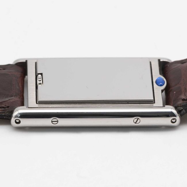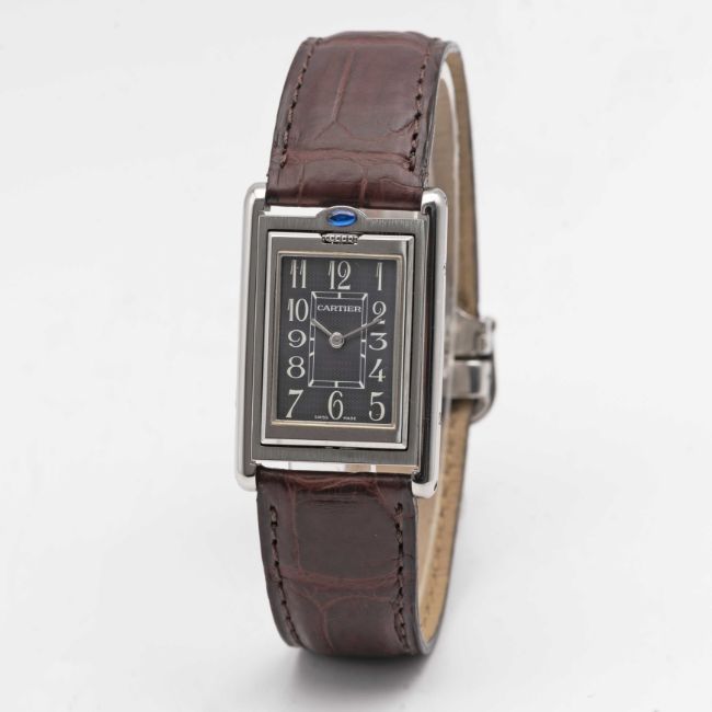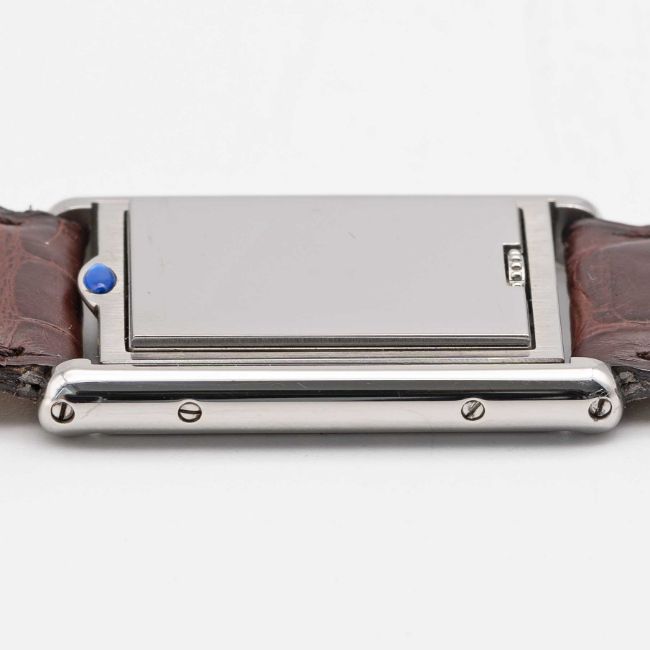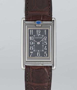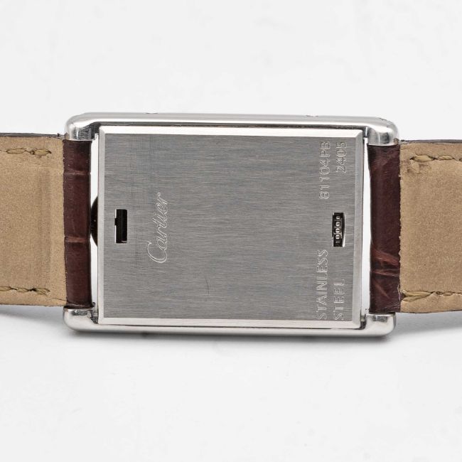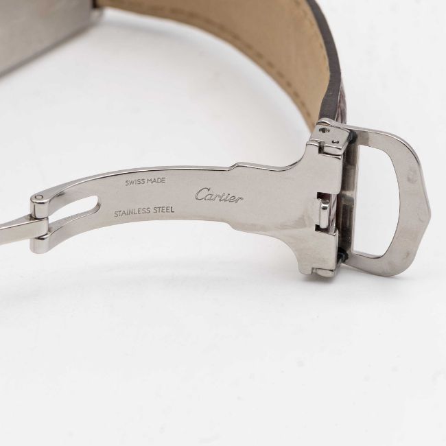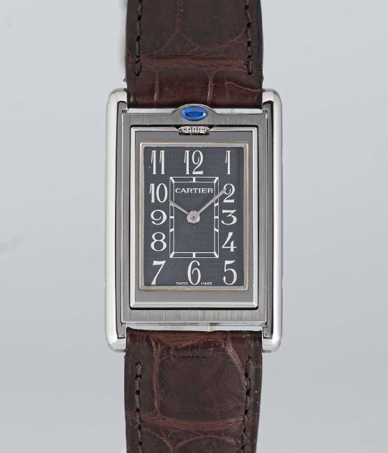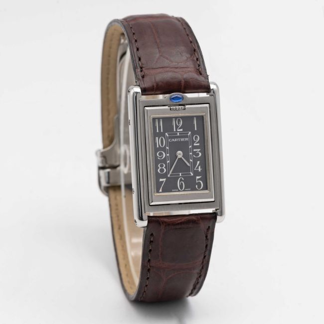 A GENTLEMAN'S SIZE STAINLESS STEEL CARTIER TANK BASCULANTE WRIST WATCHCIRCA 2000s, REF. 2405 WITH GREY ARABIC NUMERAL DIALMovement: Quartz, signed Cartier.Case: Approx. 35.4mm by 23.6mm, Reverso style case, signed Cartier, numbered.Strap: Cartier leather strap & deployment clasp.CONDITION REPORTDial: Original dial in excellent condition.Movement: Running & functioning at present, timekeeping and accuracy cannot be guaranteed.Case: In excellent condition, with some light scratches due to general use.Strap/Bracelet: In excellent condition.