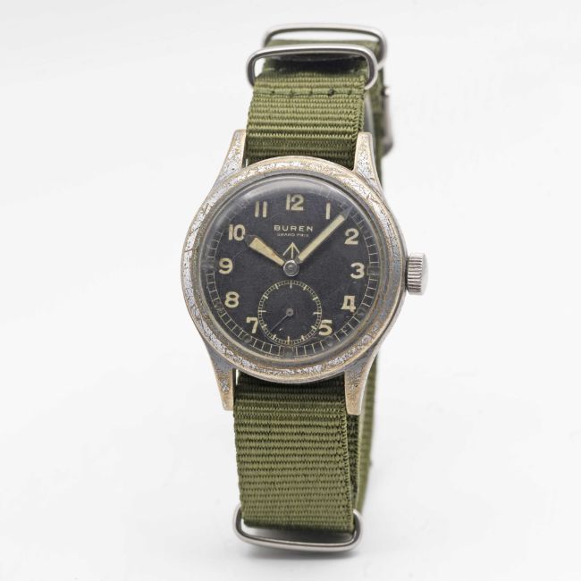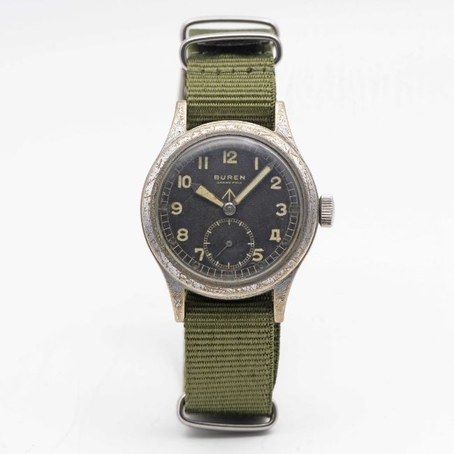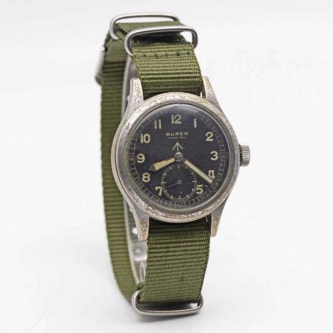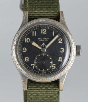 A GENTLEMAN'S BRITISH MILITARY BUREN GRAND PRIX W.W.W. WRIST WATCHCIRCA 1945, PART OF THE "DIRTY DOZEN"Movement: 15J, manual wind, signed Buren Grand Prix.Case: Diameter approx. 36mm, fixed bars, nickel plated case with steel screw back, issue markings ^ W.W.W. H 10396 340559.Strap: NATO.